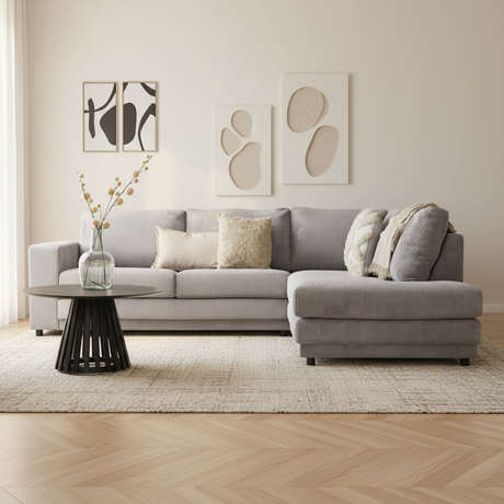 1.099,95Eenheid prijs /Niet beschikbaarHoekbank lichtgrijs ribstof plofbank Gabi - links