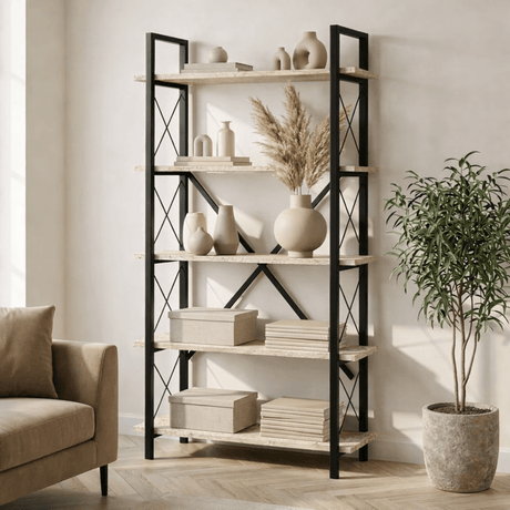 Industriële Boekenkast Ely Travertin Melamine - Zwart Frame - 180x90 cm
