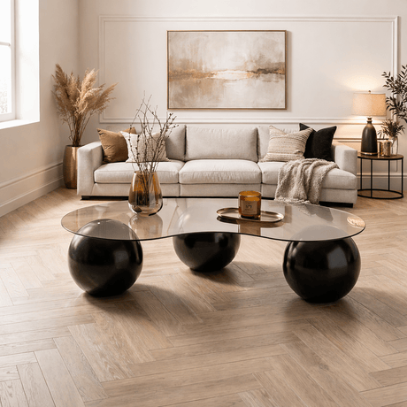 Organische salontafel brons getint glas zwarte bolpoten Sphere 120x70 cm