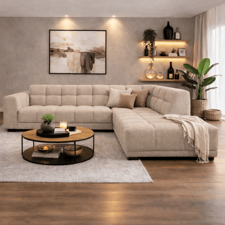 1.299,951.599,95Eenheid prijs /Niet beschikbaarHoekbank met lounge beige bouclé stof Nova - links