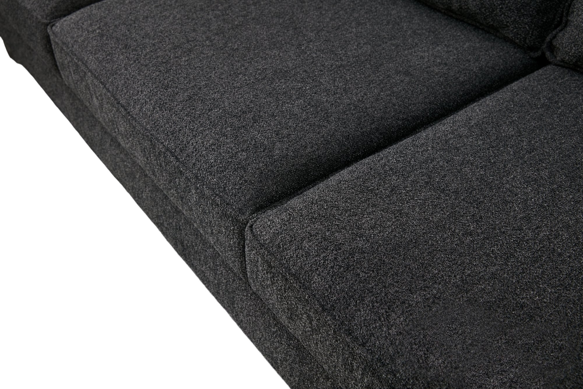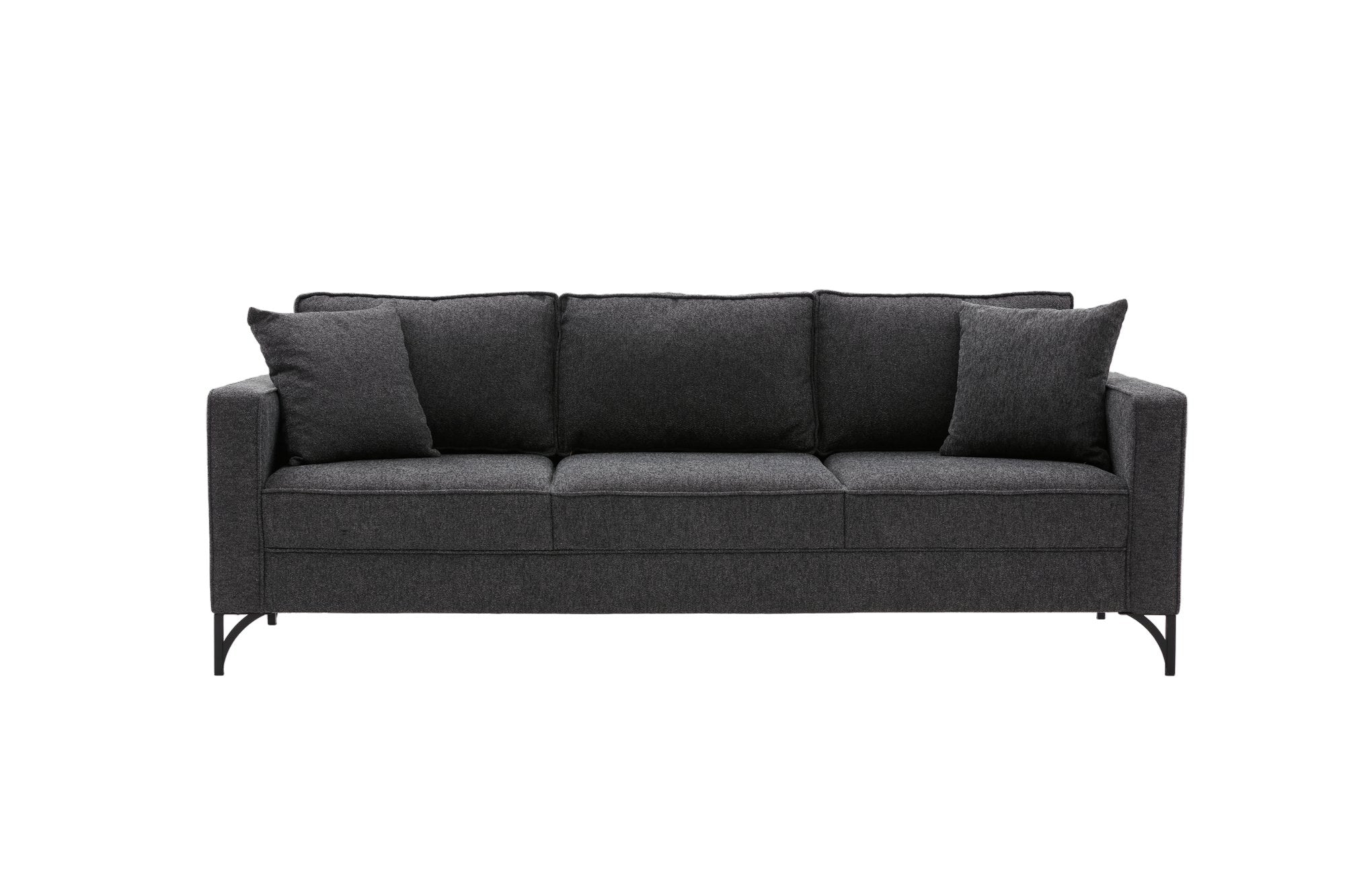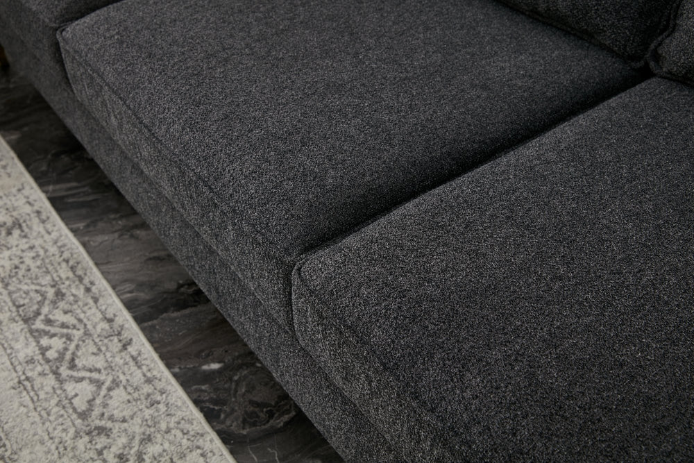 Met zijn effen kleur in antraciet en modern nieuw ontwerp past deze bank moeiteloos in elk interieur, of het nu een op een hotel geïnspireerde omgeving of een industriële loft is. De slanke metalen poten voegen een vleugje raffinement toe, waardoor het een pronkstuk wordt in elke kamer.