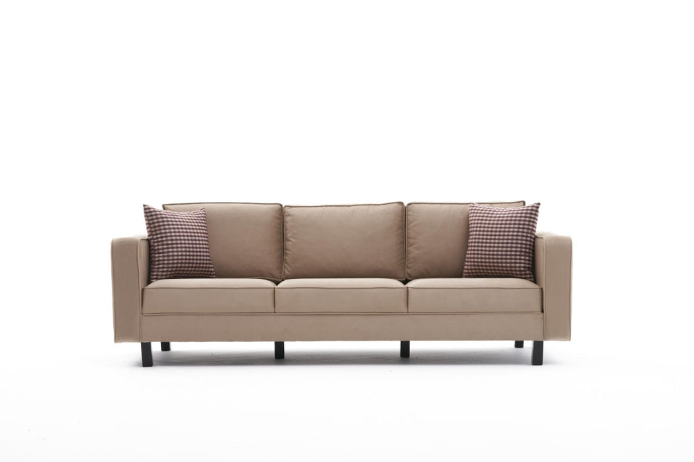 Met een modern en nieuw ontwerp combineert onze 3-zitsbank moeiteloos stijl en functionaliteit. Het beukenhouten frame voegt een vleugje verfijning toe, terwijl de fluwelen stoffen bekleding luxe en weelde uitstraalt. Door de strakke lijnen en het slanke silhouet past hij perfect in elke moderne of industriële ruimte.
