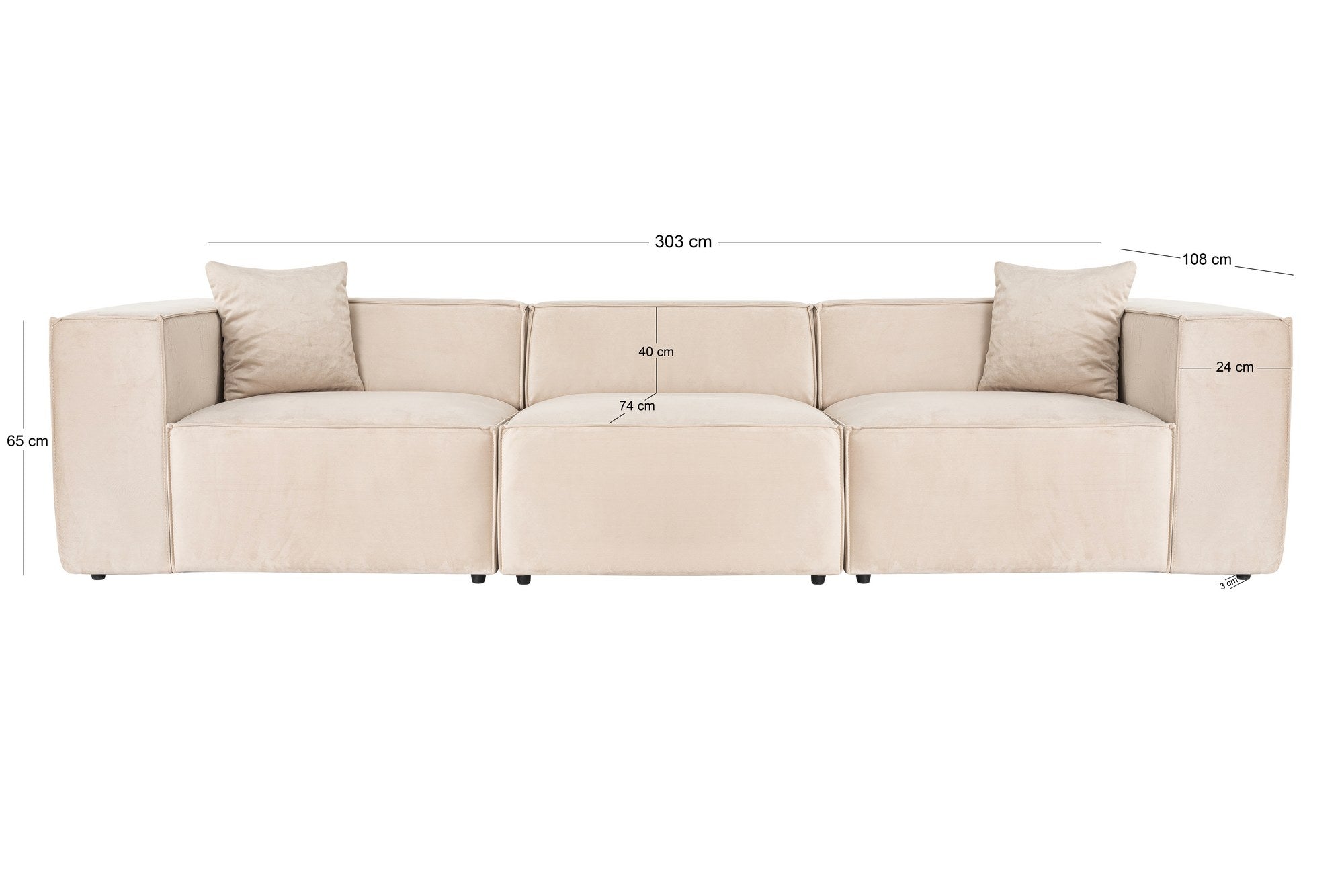 Met een lengte van 303 cm, een breedte van 108 cm en een hoogte van 65 cm biedt deze bank voldoende ruimte voor jou en je geliefden om te loungen en tot rust te komen. De zithoogte van 40 cm en zitdiepte van 74 cm zorgen voor optimaal comfort, terwijl de armleuningbreedte van 24 cm een extra vleugje gemak toevoegt.