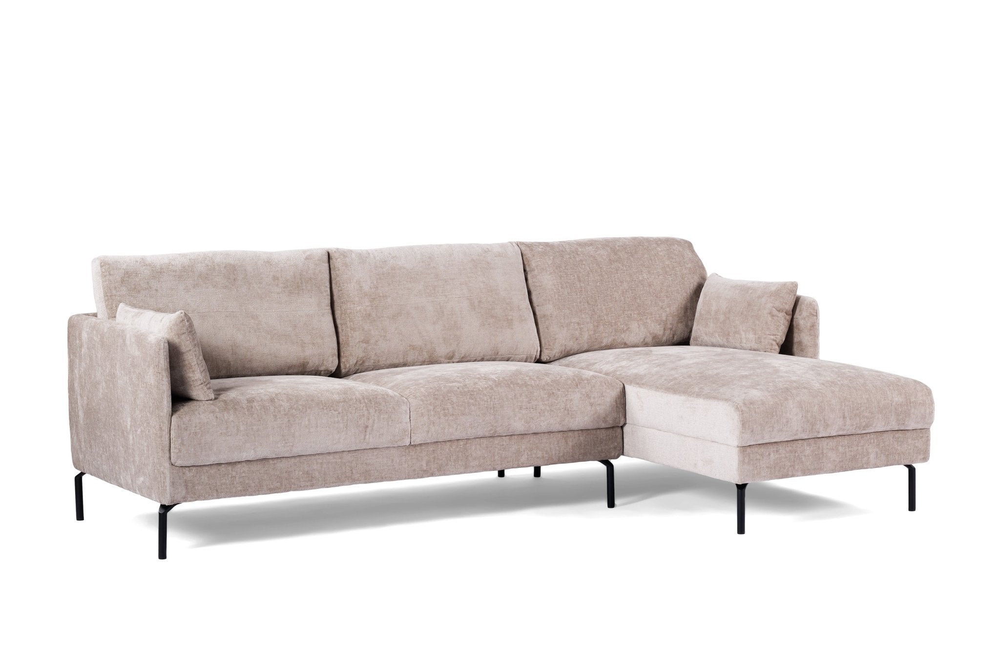 De hoekbank heeft een chique en eigentijdse uitstraling dankzij de velvet look van de stof en de zwarte metalen pootjes. De losse kussens zorgen voor extra comfort en geven de bank een speelse uitstraling maar blijven wel stevig op hun plaats zitten dankzij de klittenbandrand aan de onderkant. Het unieke aan de Lana hoekbank is dat de chaise longue naar wens zowel links als rechts geplaatst kan worden, waardoor je de indeling van je woonkamer gemakkelijk kunt aanpassen.
