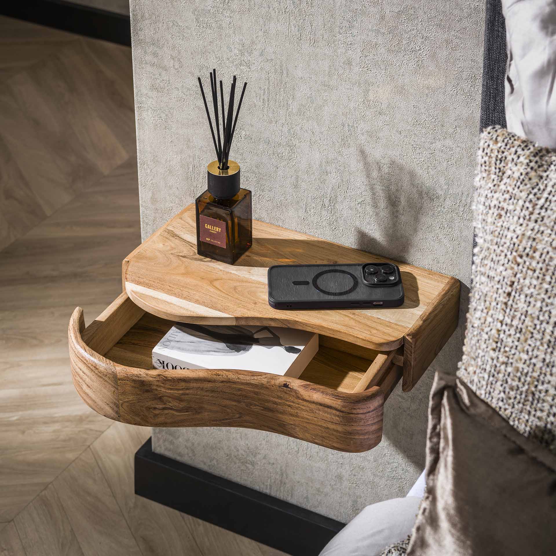 Maak je slaapkamer compleet met de Nova wand-nachtkastjes, geleverd als set van 2 in links en rechts uitvoering. Deze zwevende nachtkastjes zijn gemaakt van massief acaciahout met een prachtige organische rand die de natuurlijke tekening van het hout benadrukt. Dankzij het compacte formaat creëer je praktische opbergruimte naast je bed zonder vloeroppervlak te verliezen. Perfect te combineren met moderne, industriële en Scandinavische interieurs.