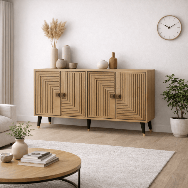 De Ahart console heeft een moderne, elegante look met een verfijnde eikenlook in Sapphire Oak en luxe goudaccenten. De combinatie van houtwarmte en metallic details past prachtig in een modern interieur, maar voelt zich ook helemaal thuis in hotel chique, Scandinavisch of een zachte glam stijl. Door het luchtige ontwerp oogt je ruimte ruimtelijk en opgeruimd, terwijl je toch extra opbergruimte en afzetplek creëert.