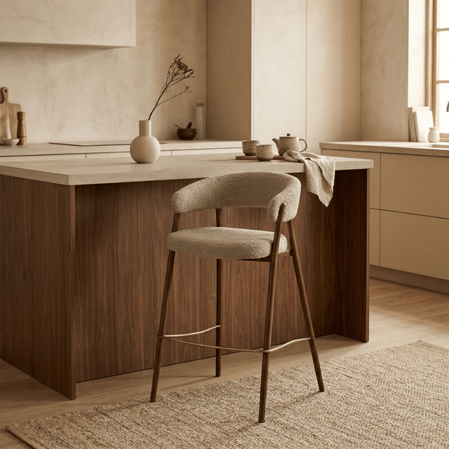 De Ryo barstoel combineert Japandi eenvoud met eigentijds design. De zachte bouclé bekleding in zandkleur en het warme walnootlook frame geven je keuken eiland of bar een serene, natuurlijke uitstraling. De afgeronde vormen en comfortabele rugleuning rugleuning maken van Ryo een perfecte barkruk voor een sfeervolle uitstraling in je interieur.