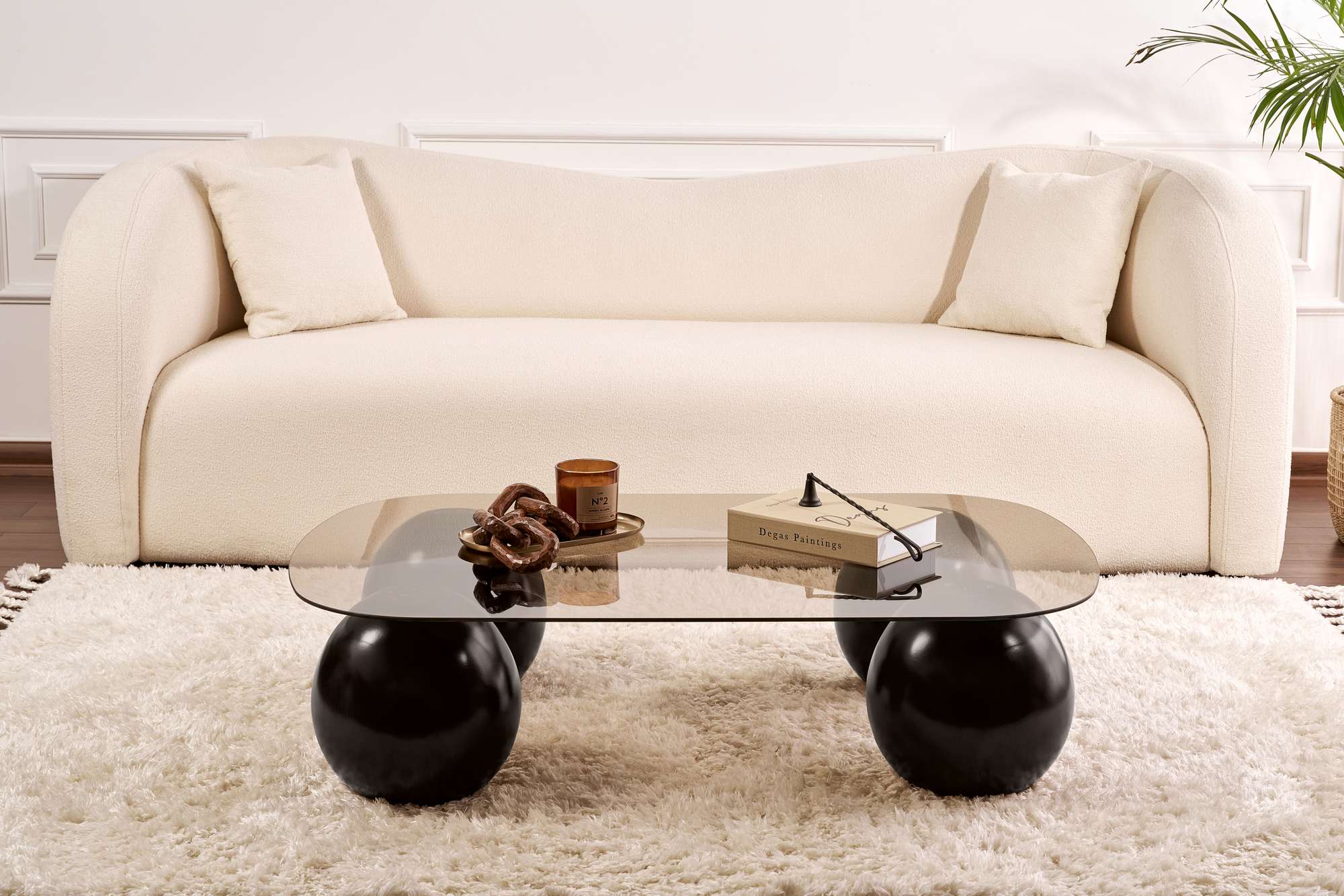 Deens ovale salontafel brons getint glas zwarte bolpoten Evara 118x75 cm