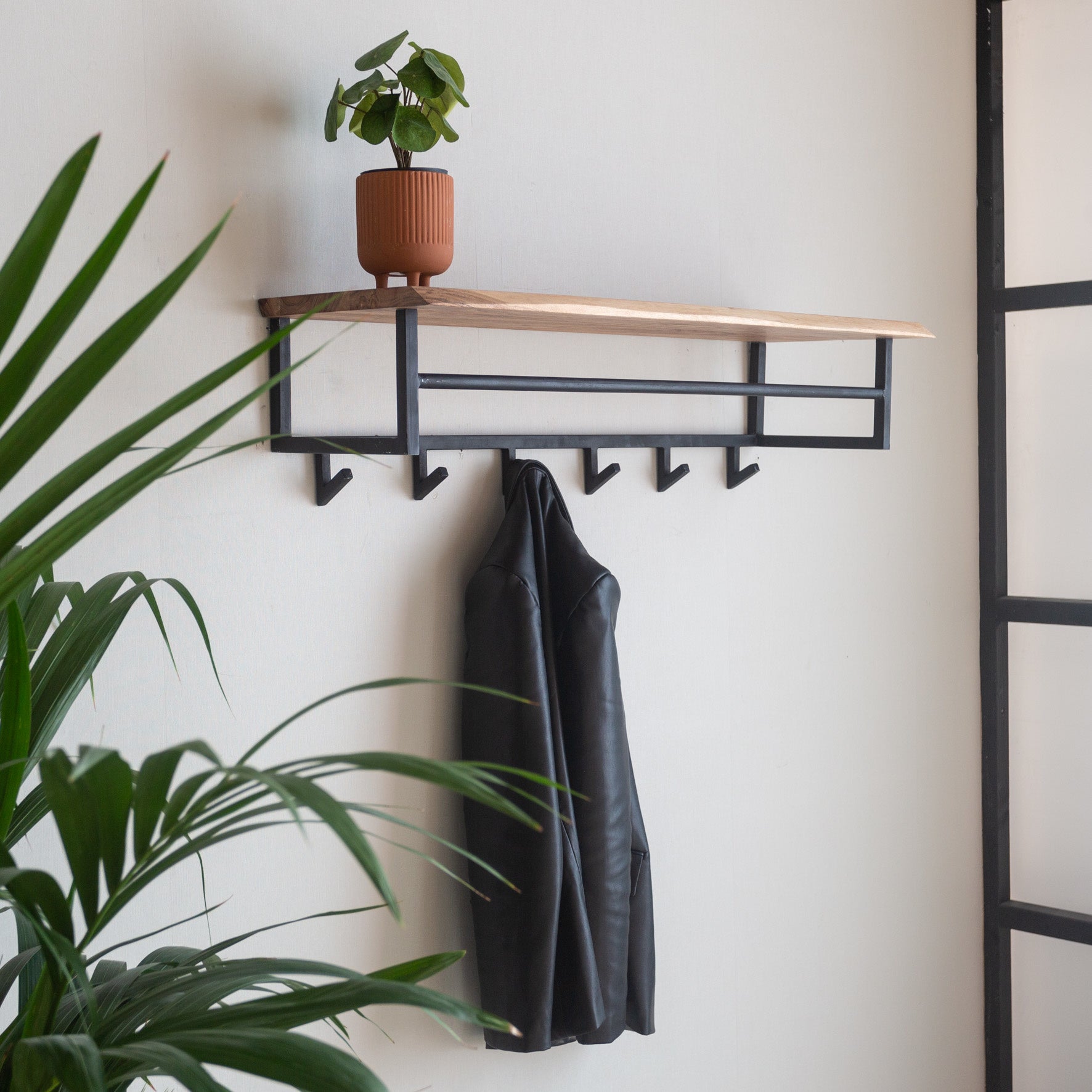 Industriële Kapstok Niels 6-haaks Acaciahout - Met Hoedenplank