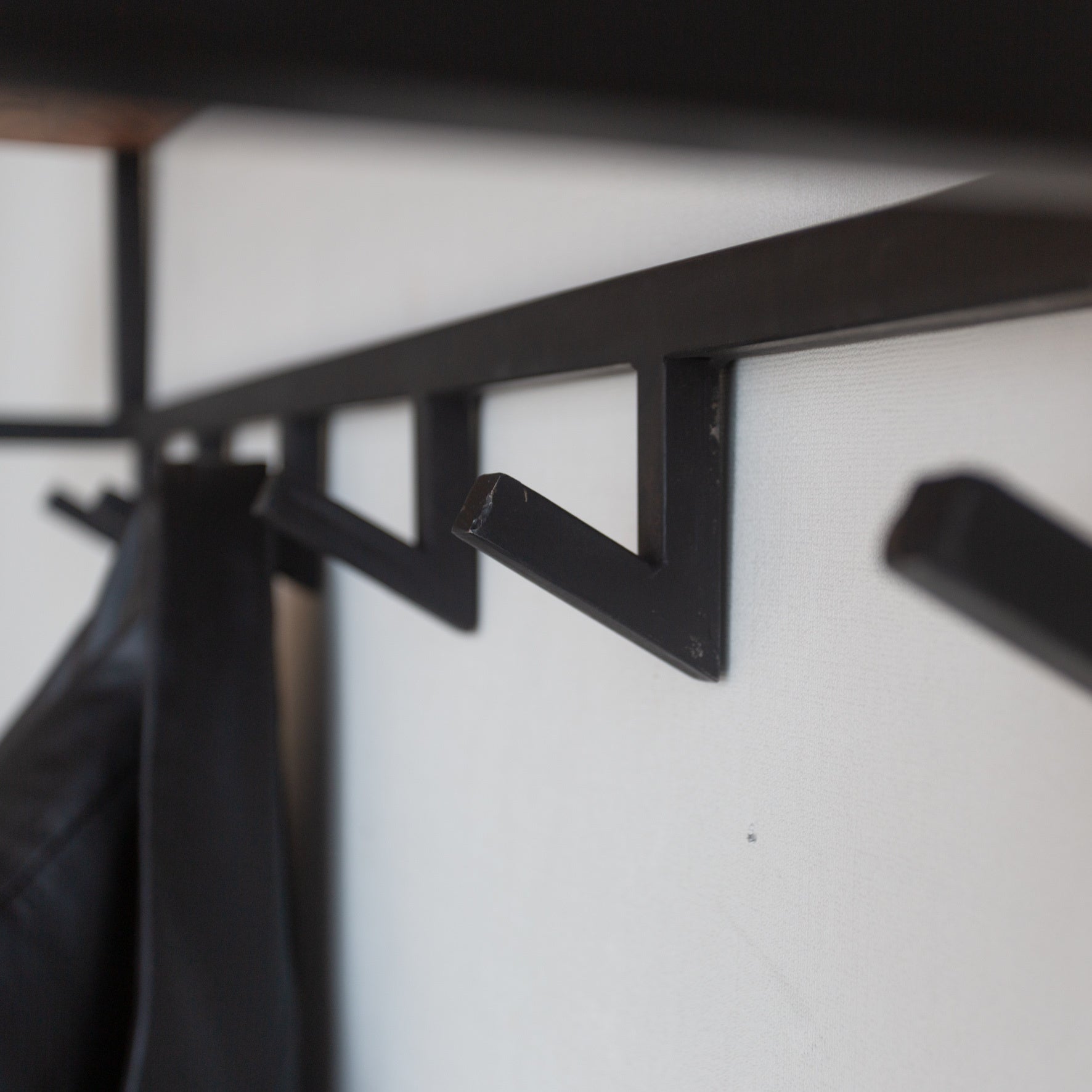 Beschrijving en specificaties van Industriële Kapstok Niels 6-haaks Acaciahout - Met Hoedenplank