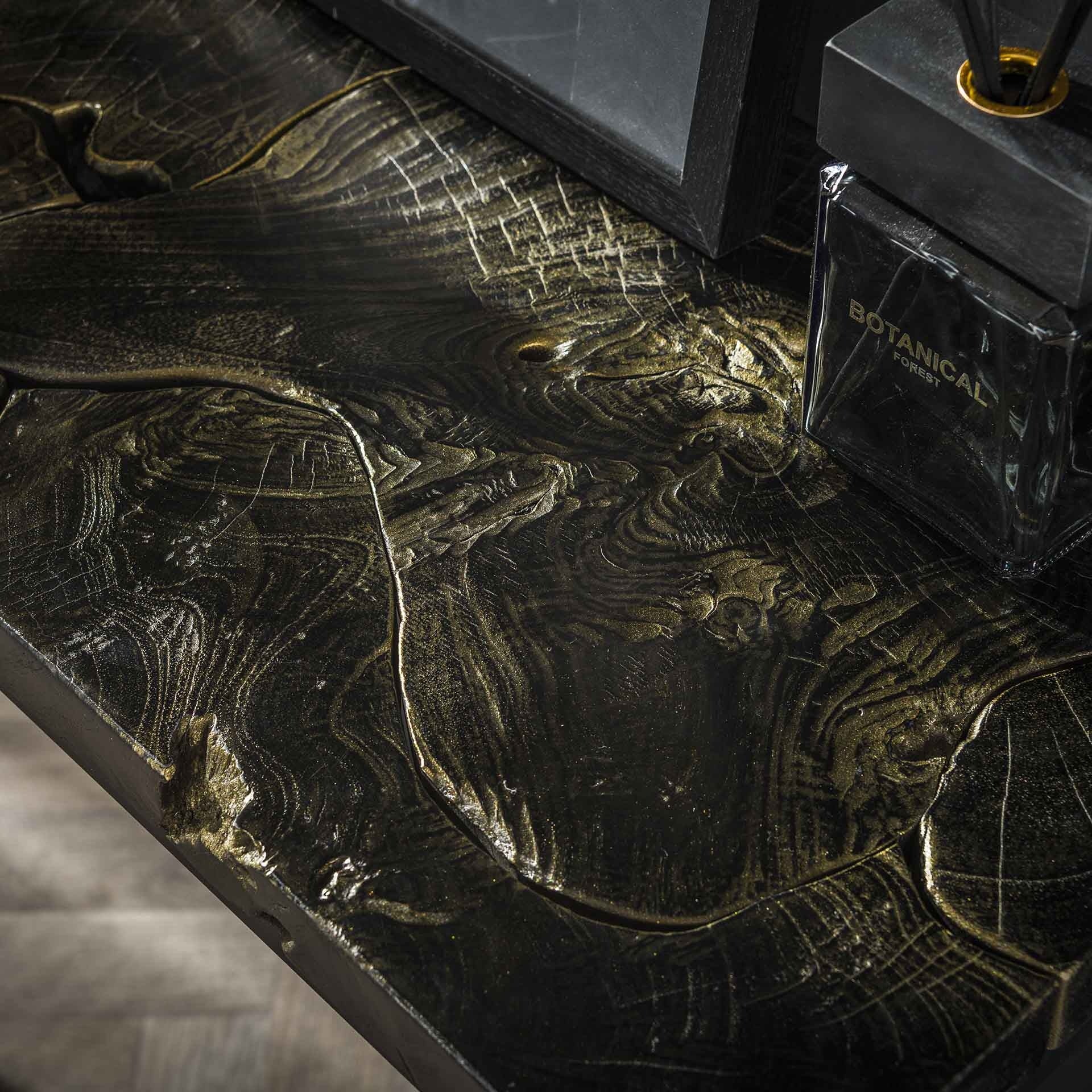 Het blad van de Minette sidetable is gemaakt van zwart teakhout, afgewerkt met een gouden finish. Het tafelblad is zwart met een gouden finish gespoten, dit zorgt voor een sfeervol effect. Meubels van teak staan er om bekend dat ze jarenlang in goede staat verkeren. Teak is van zichzelf een vettige houtsoort wat nauwelijks splintert. Hierdoor blijft je meubel zelfs zonder onderhoud zeer lang mooi.