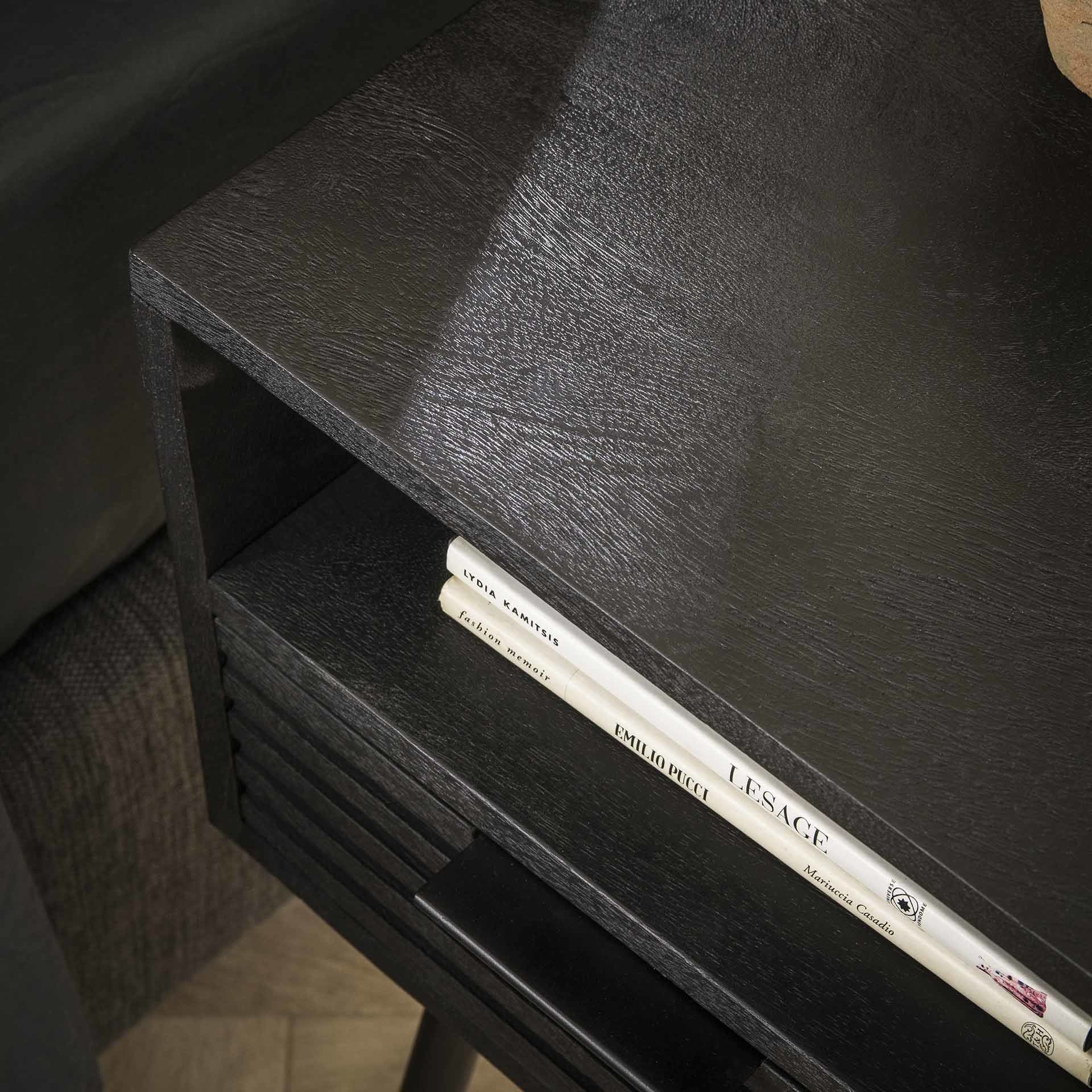 De combinatie van het open vak met de dichte lade maakt het zwarte nachtkastje niet alleen functioneel om spullen in op te bergen maar ook om mooie boeken te laten zien.