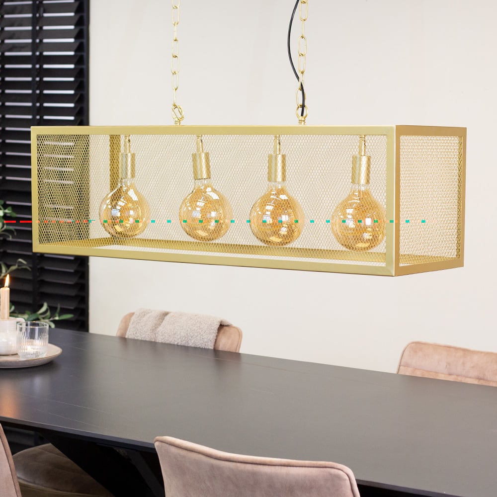 Industriële hanglamp Duncan is met zijn goudkleurige afwerking een echte eyecatcher boven jouw eettafel! De hanglamp heeft een industriële look en wordt aan het plafond bevestigd middels kettingen. Perfect als je op zoek bent naar een opvallende hanglamp!