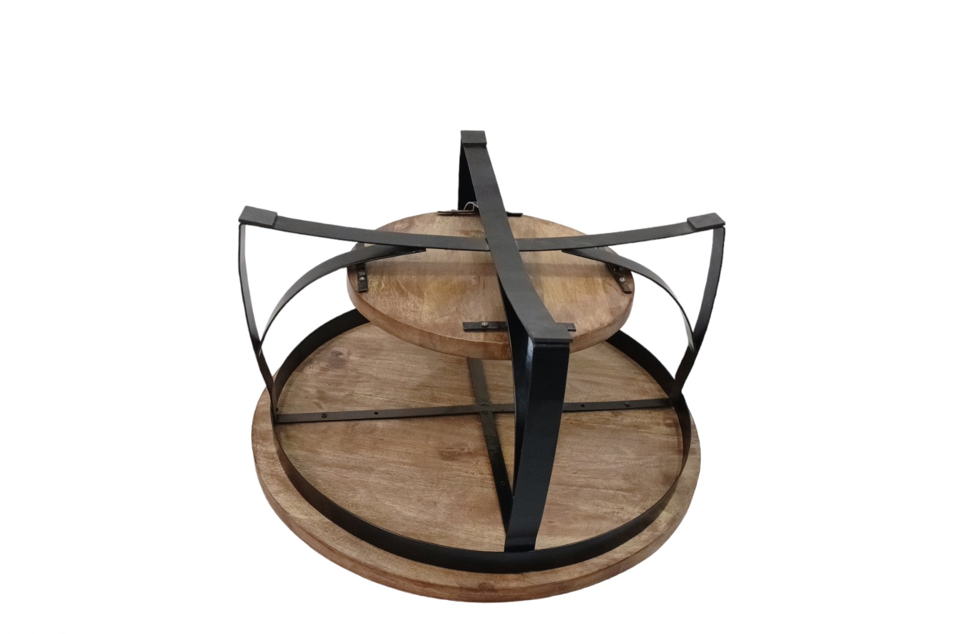 De Oxis is een ronde salontafel van massief Mangohout met een zwart metalen frame. Een grote salontafel met een houten opbergblad eronder. Oxis is in verschillende formaten en varianten verkrijgbaar.
