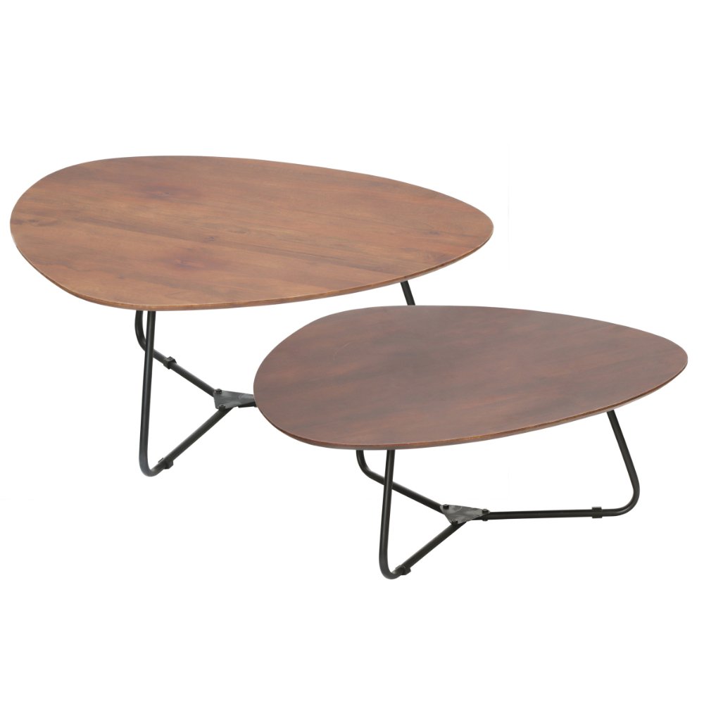 Organische salontafel set van 2 Zoë is een ware eyecatcher in jouw interieur. Een modern en stijlvol design met een unieke uitstraling door de organische vorm. De salontafel set bestaat uit 2 verschillende formaten salontafels, gemaakt van mangohout, waarvan het kleine formaat is afgewerkt met een donkere walnootkleurige finish en het grote formaat met een walnootkleurige finish. Een duurzaam product met een mooie afwerking. Het frame van de tafels is gemaakt van zwart metaal, dat zorgt voor stabiliteit en stevigheid. De moderne, stijlvolle uitstraling van de tafel maakt het gemakkelijk te combineren met verschillende interieurstijlen, vooral in een Modern of Japandi interieurstijl komt deze tafel goed tot zijn recht. Door organische vormen aan je interieur toe te voegen worden strakke lijnen doorbroken en breng je speelsheid en warmte in je interieur. Organische salontafel set van 2 Zoë zorgt voor dynamiek en creëert warmte in je interieur.