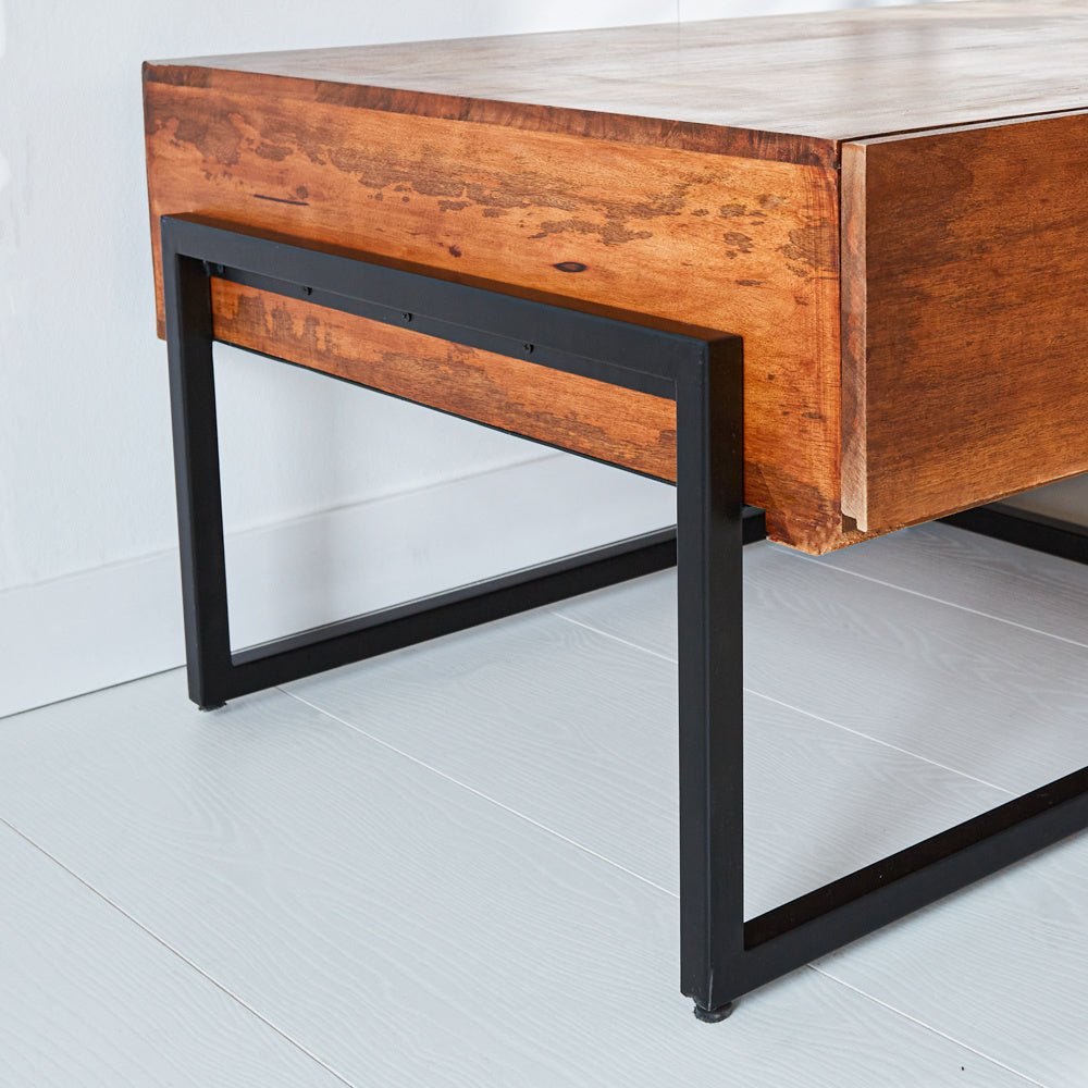 Het frame van tv-meubel Emma is gemaakt van zwart metaal. De combinatie van mangohout en zwart metaal is perfect voor ieder interieur. De handvatten van de lades zijn ook gemaakt van metaal en dragen ook bij aan de industriële stijl.