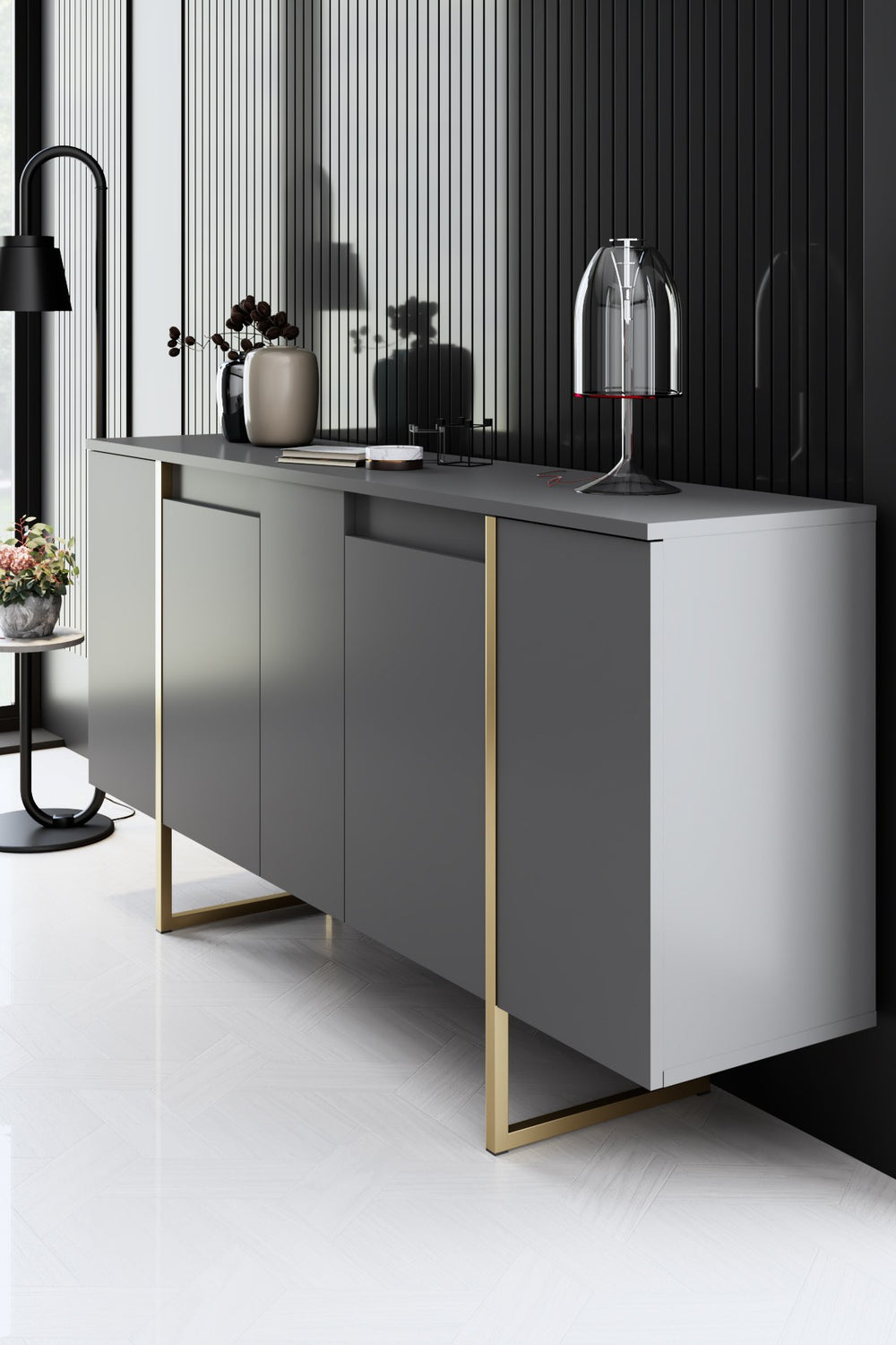 Beschrijving en specificaties van Modern Dressoir Antraciet Luxe 160x80x35 - Gouden Frame