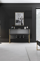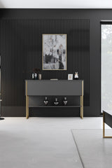 Het dressoir is ontworpen met een strakke en moderne esthetiek, met een prachtige combinatie van goud- en antracietkleuren die het uiterlijk van elke kamer direct zullen verbeteren. De metalen poten voegen een vleugje glamour en stabiliteit toe, waardoor het een perfecte aanvulling is op je interieur.