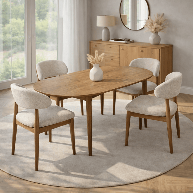 Wat deze tafel bijzonder maakt, is haar slimme uitschuifsysteem. In gesloten stand heeft de tafel een compacte ronde vorm van 100 cm – ideaal voor dagelijks gebruik of kleinere ruimtes. Wanneer u extra gasten ontvangt, schuift u de tafel eenvoudig uit tot 130 cm. Zo ontstaat een royale ovale tafel met extra zitplaatsen, zonder in te leveren op uitstraling.