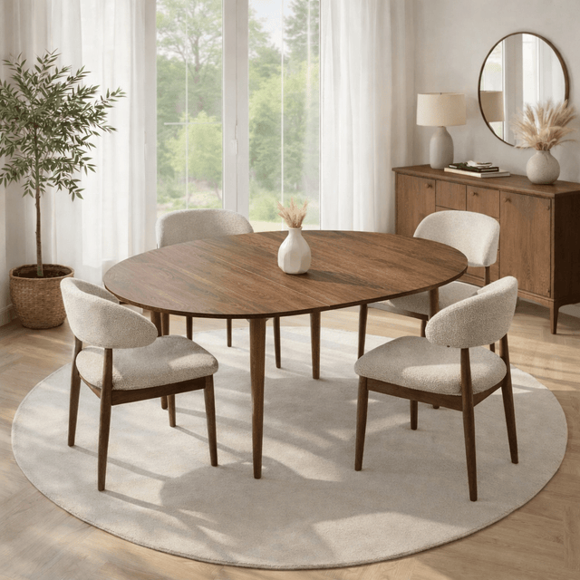 Met haar uitgebalanceerde formaat biedt de Vienna voldoende ruimte voor gezellige diners met familie en vrienden, terwijl ze compact genoeg blijft om luchtigheid in de ruimte te behouden. De walnootkleur laat zich eenvoudig combineren met diverse stoelstijlen en woonaccessoires.