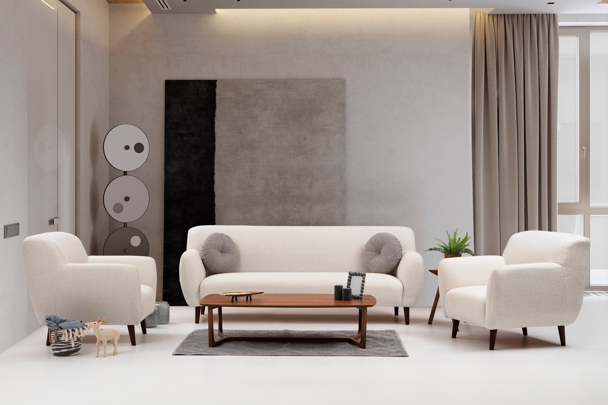 Beschrijving en specificaties van Japandi fauteuil beige textuur stof met walnoot poten Enna