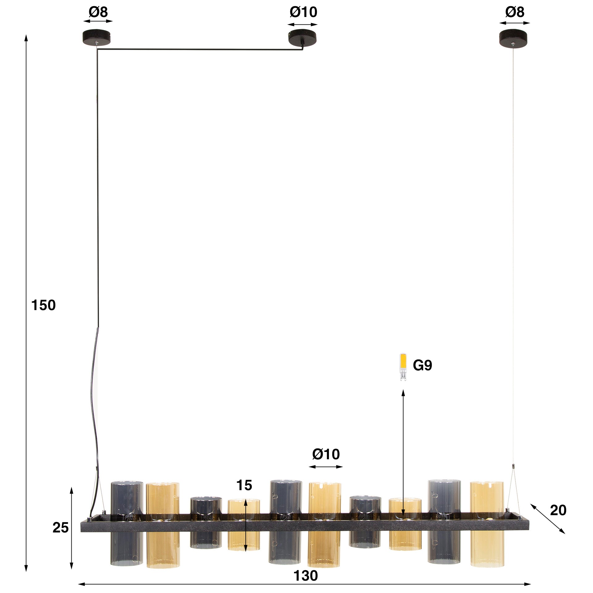 Beschrijving en specificaties van Hanglamp Khai 10-lichts cilinder gemixt glas