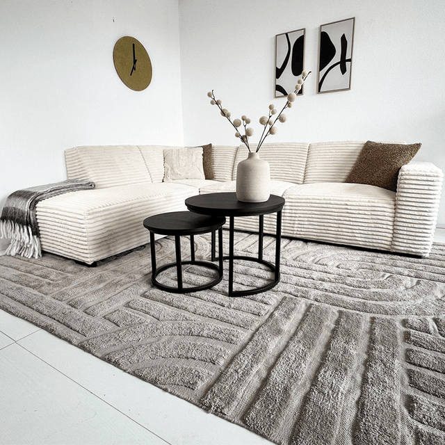 Wat deze hoekbank echt uniek maakt, is het gebruik van mega ribstof in een horizontaal patroon, waardoor het stuk een eigentijdse uitstraling krijgt die perfect past in moderne en Scandinavische interieurs. De stof, met de naam Ambiance, voegt een vleugje elegantie en helderheid toe aan elke woonkamer.