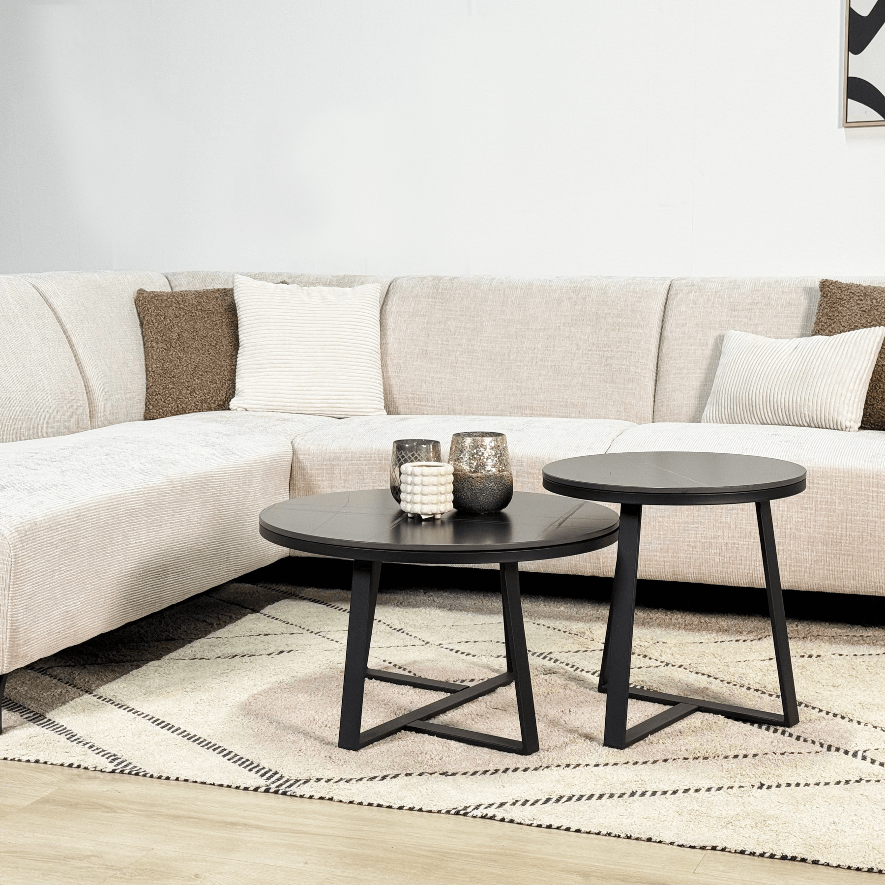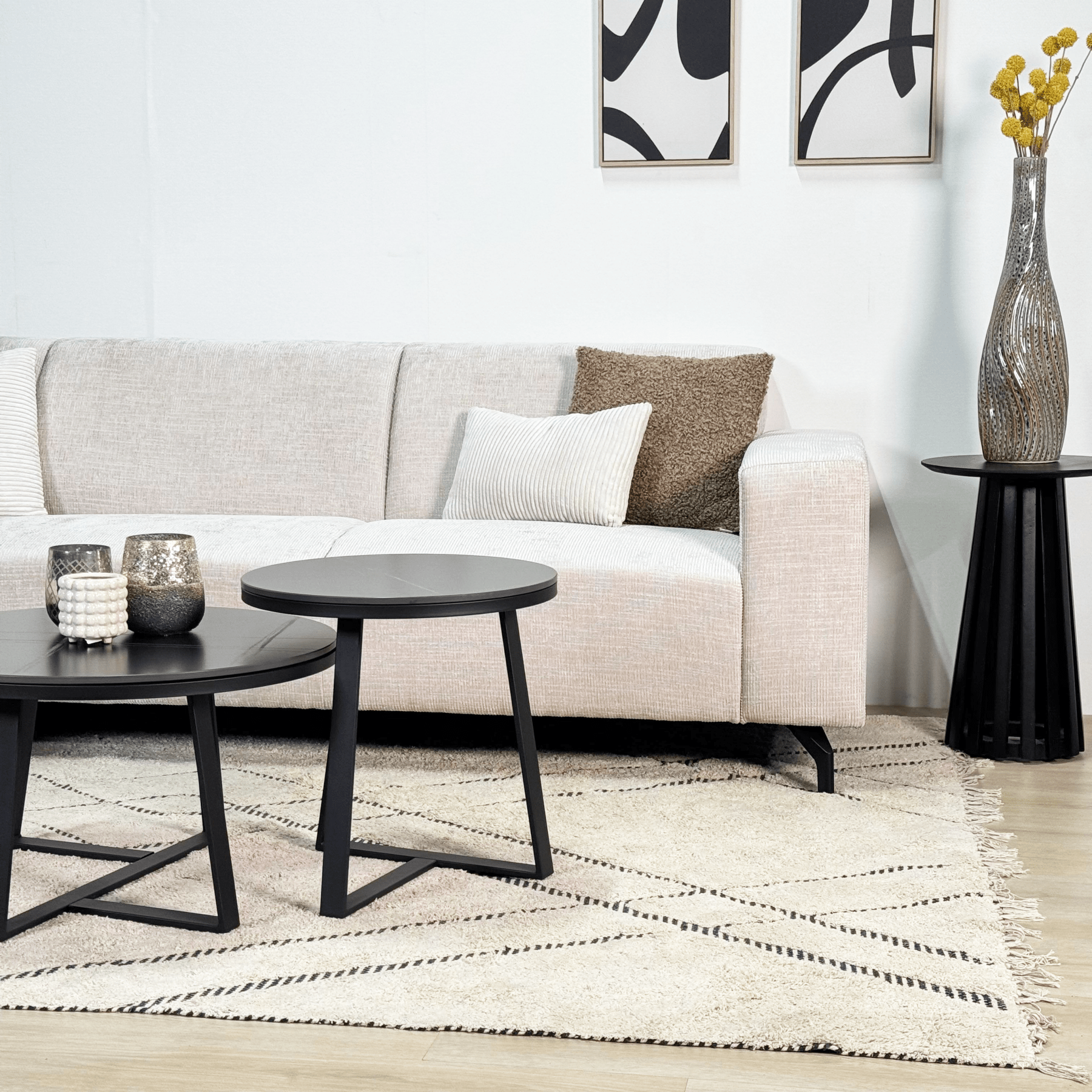 Hoekbank Manon heeft een strak, modern ontwerp met een stevige en robuuste uitstraling. De vaste kussens zorgen voor een gestroomlijnde look en bieden consistent comfort. De vaste kussens zijn zorgvuldig ontworpen om optimale ondersteuning te bieden, zonder concessies te doen aan het zitcomfort. De slanke, metalen poten voegen een industrieel accent toe, wat de bank een eigentijdse twist geeft. De metalen poten zijn stevig en duurzaam, wat niet alleen bijdraagt aan de stabiliteit van de bank, maar ook aan de moderne uitstraling.