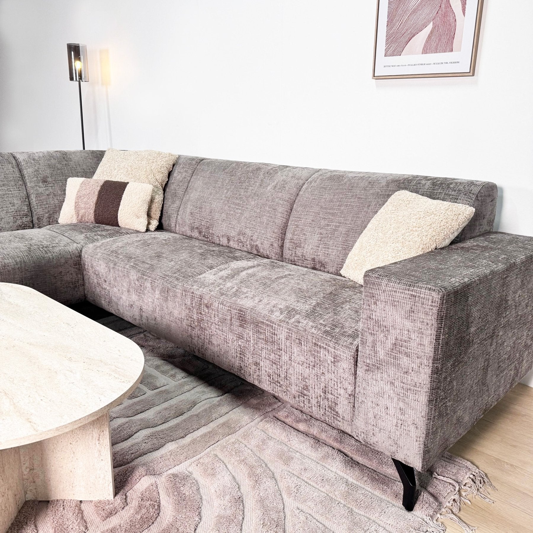 De royale afmetingen van de hoekbank maken het een perfecte keuze voor grotere woonkamers, terwijl de strakke lijnen en slanke poten ervoor zorgen dat de bank visueel niet te zwaar oogt. De ruime hoek biedt extra comfort en maakt het gemakkelijk om lekker languit te liggen.