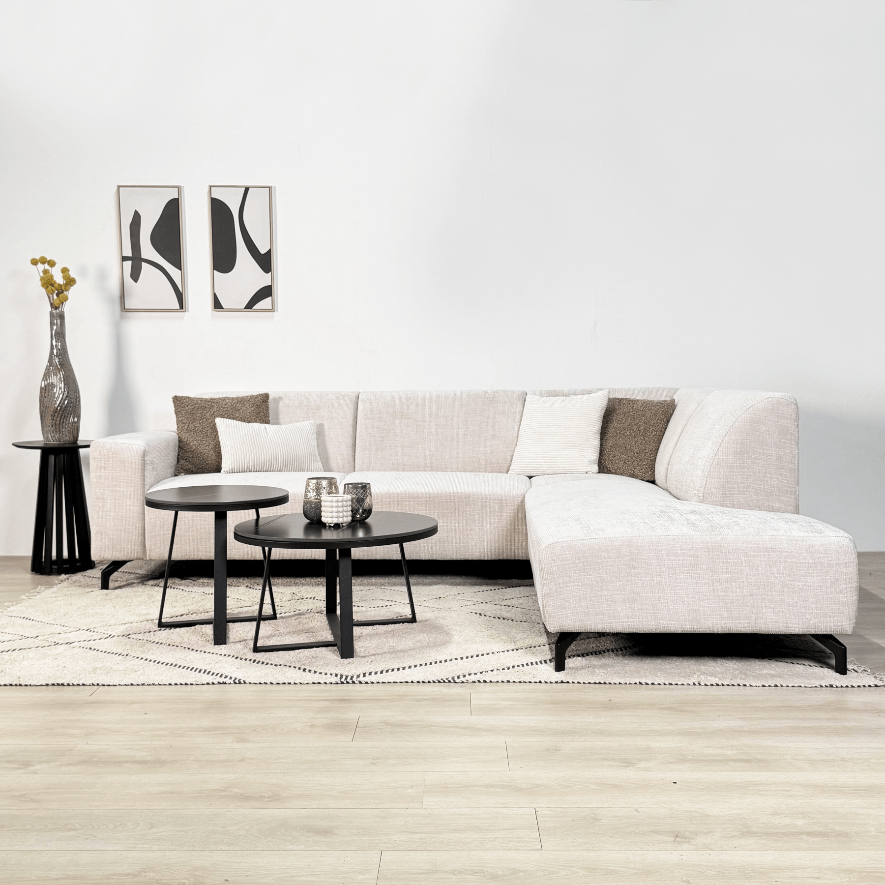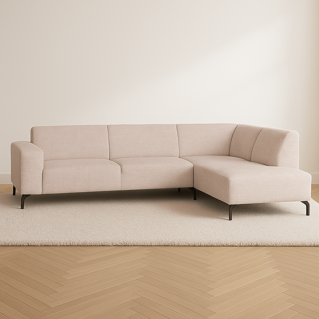 De royale afmetingen van de hoekbank maken het een perfecte keuze voor grotere woonkamers, terwijl de strakke lijnen en slanke poten ervoor zorgen dat de bank visueel niet te zwaar oogt. De ruime hoek biedt extra comfort en maakt het gemakkelijk om lekker languit te liggen.