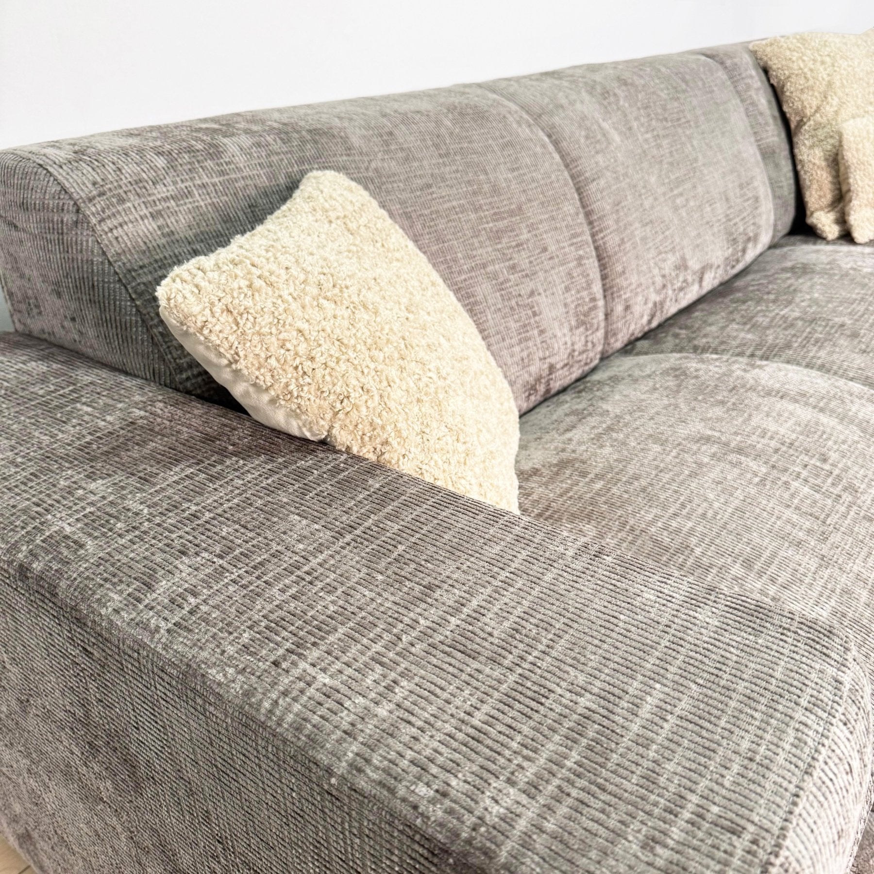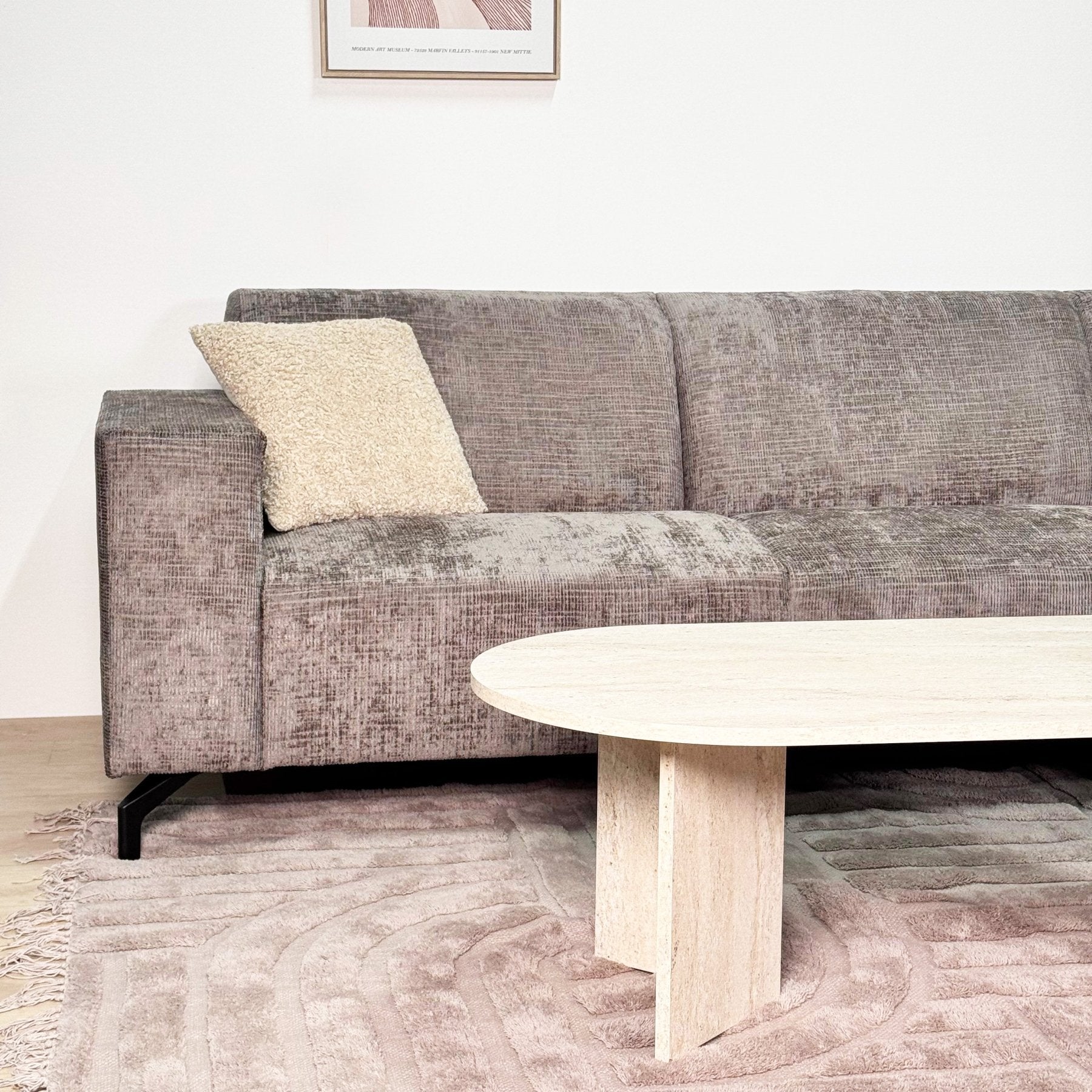 De bank is bekleed met hoogwaardig grof chenille, een duurzame stof die bestand is tegen slijtage en tegelijkertijd een zachte, luxueuze textuur biedt. De grof geweven chenille stof geeft de bank een opvallende textuur en een rijke uitstraling.