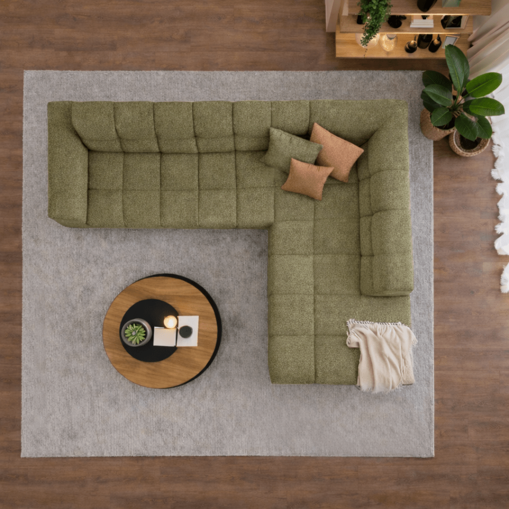 Beschrijving en specificaties van Hoekbank met lounge olijf groen bouclé stof Nova - rechts