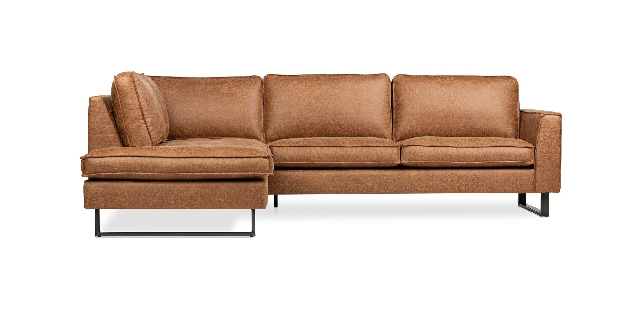 De industriële hoekbank Tulin cognac is gemaakt van een vlekwerende microvezel stof en heeft moderne metalen poten. Deze slijtvaste hoekbank heeft een comfortabele zit door zijn brede en zachte kussens.
