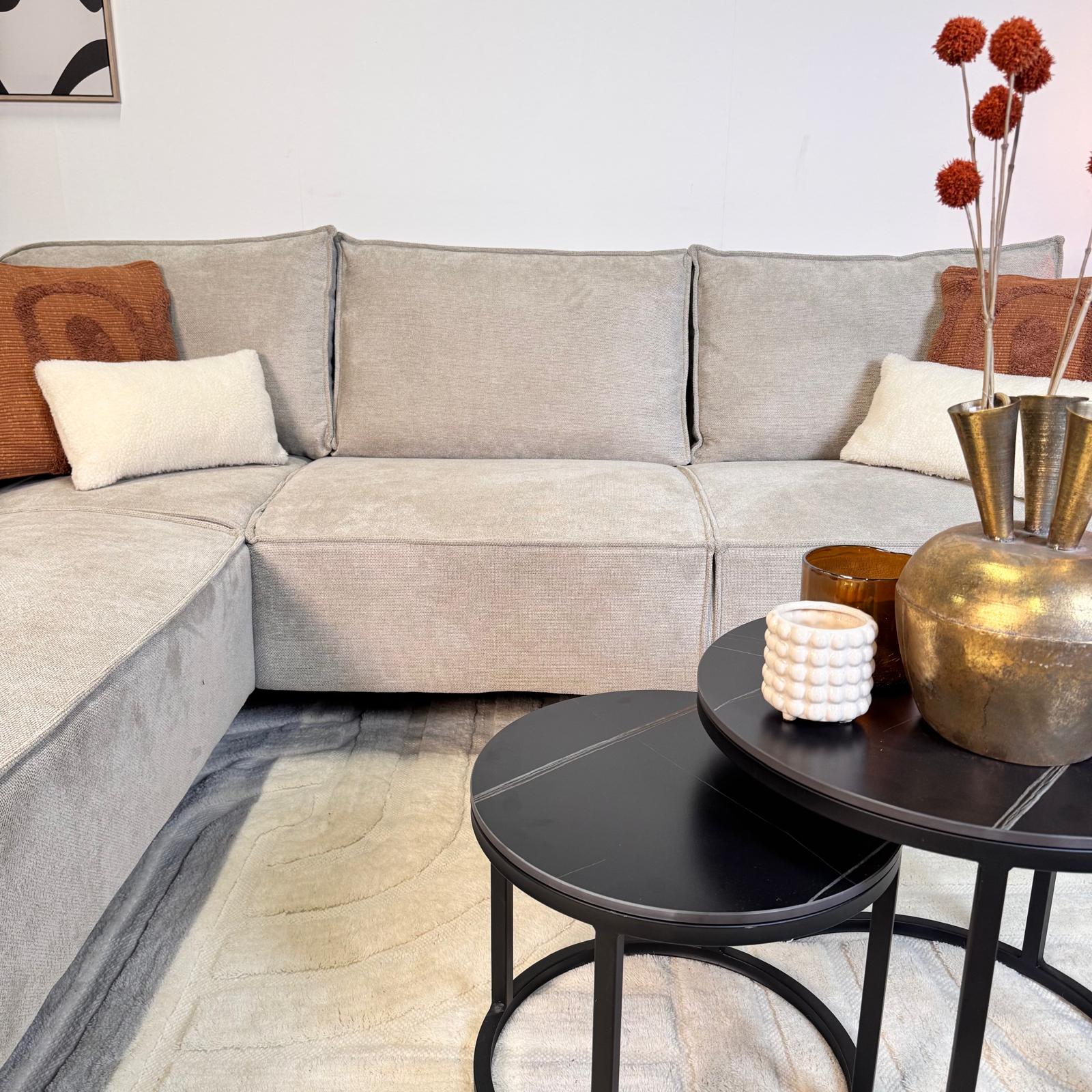 Creëer een stijlvolle en comfortabel zithoek met hoekbank Yara met chaise longue links in een chenille beige stof. Deze hoekbank heeft een modern en tijdloos ontwerp dat geschikt is voor diverse interieurstijlen. Hoekbank Yara biedt niet alleen een royaal zitcomfort, maar voegt ook een verfijnde textuur en elegante uitstraling toe aan je woonkamer.