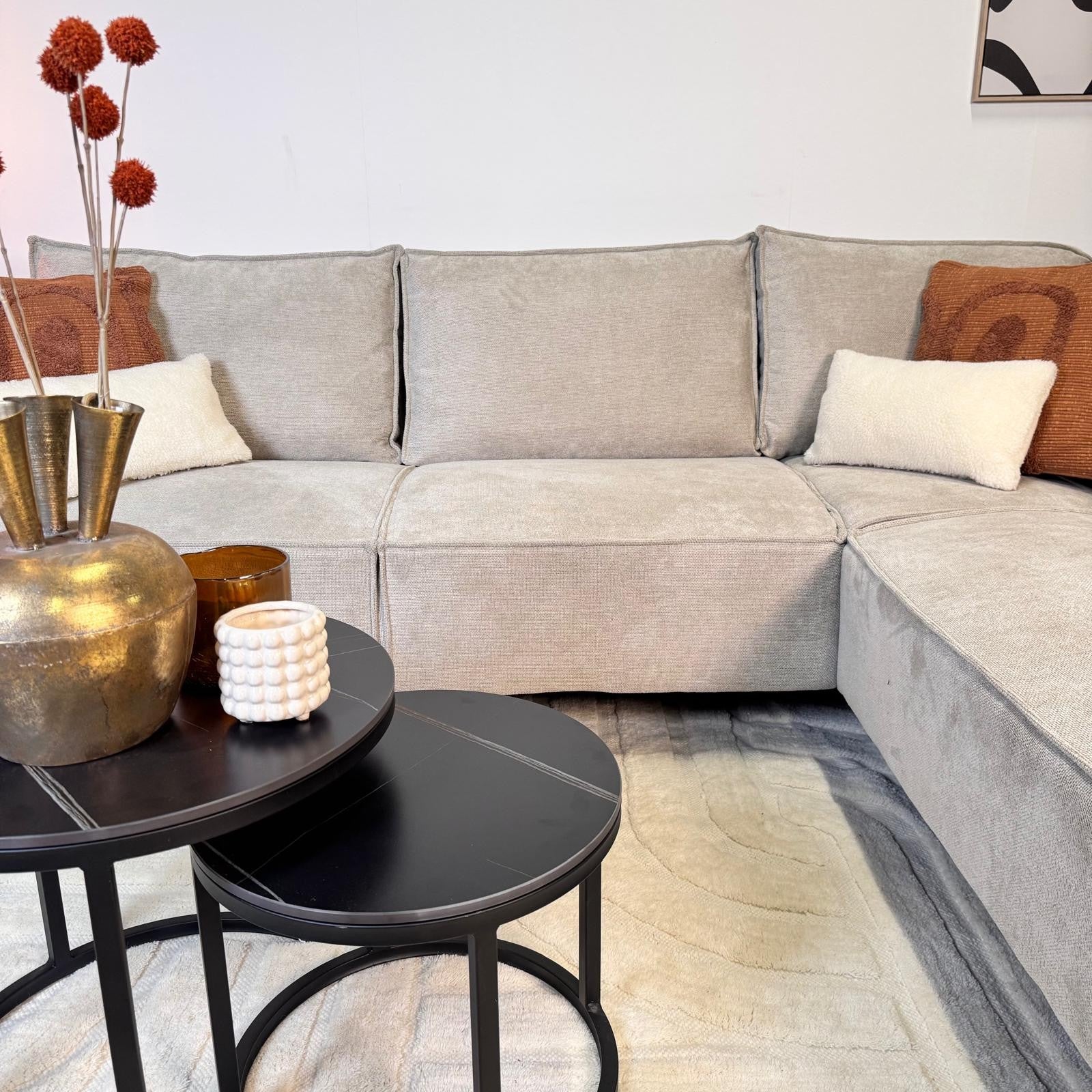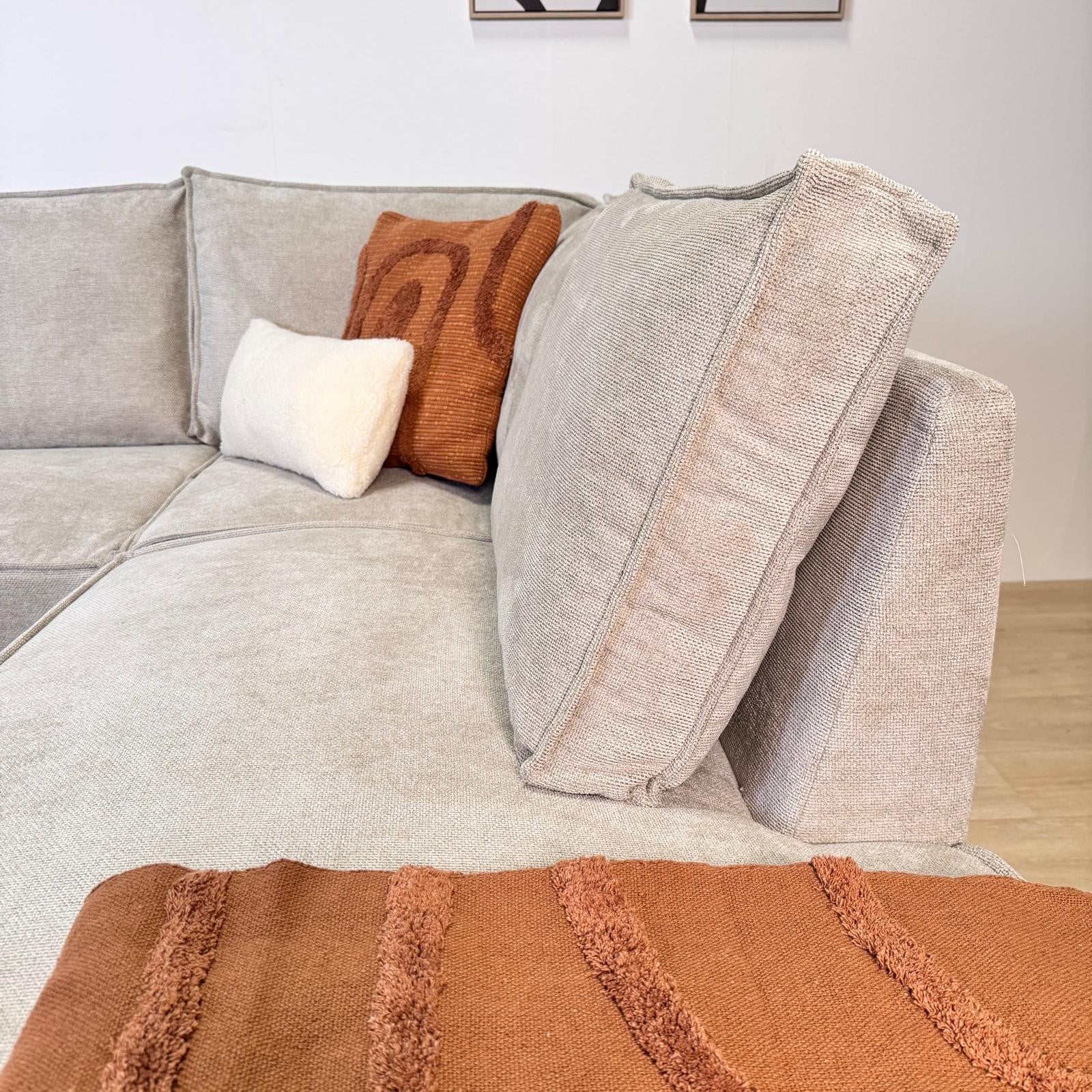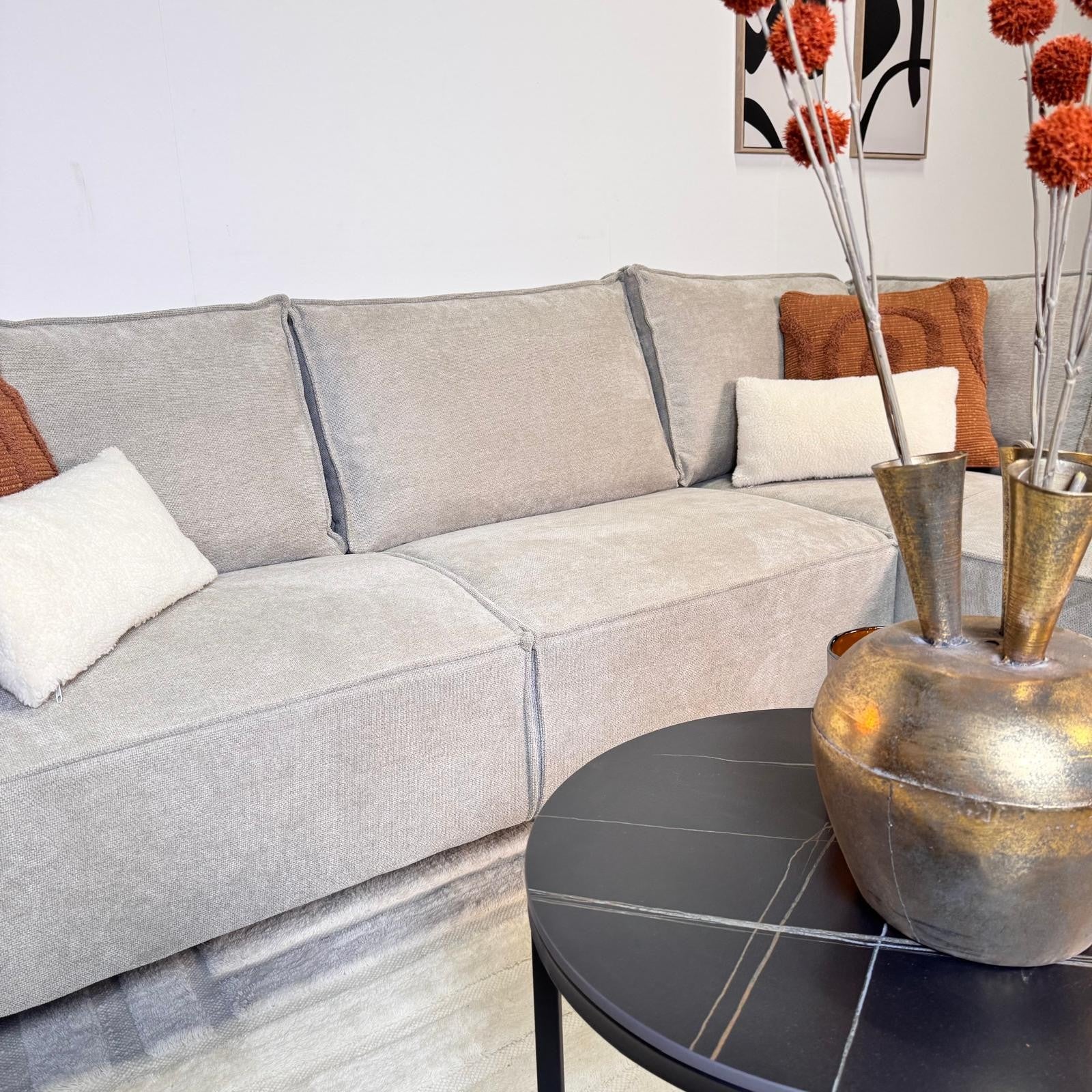 Hoekbang Yara is bekleed met een zachte en duurzame chenille stof in een beige kleur. Je kunt de kleur ook warm grijs noemen, of greige; een boventoon van grijs met een ondertoon van taupe. Chenille staat bekent om het comfortabele en luxe gevoel. De stof geeft de bank een rijke, zachte textuur en een licht glanzende afwerking die een vleugje luxe toevoegt aan je interieur.