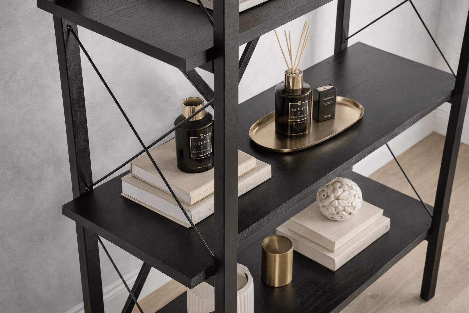 - Tijdloze "All-Black" look: De volledige zwarte uitvoering (frame én planken) zorgt voor een strakke, moderne uitstraling die nooit uit de mode raakt.