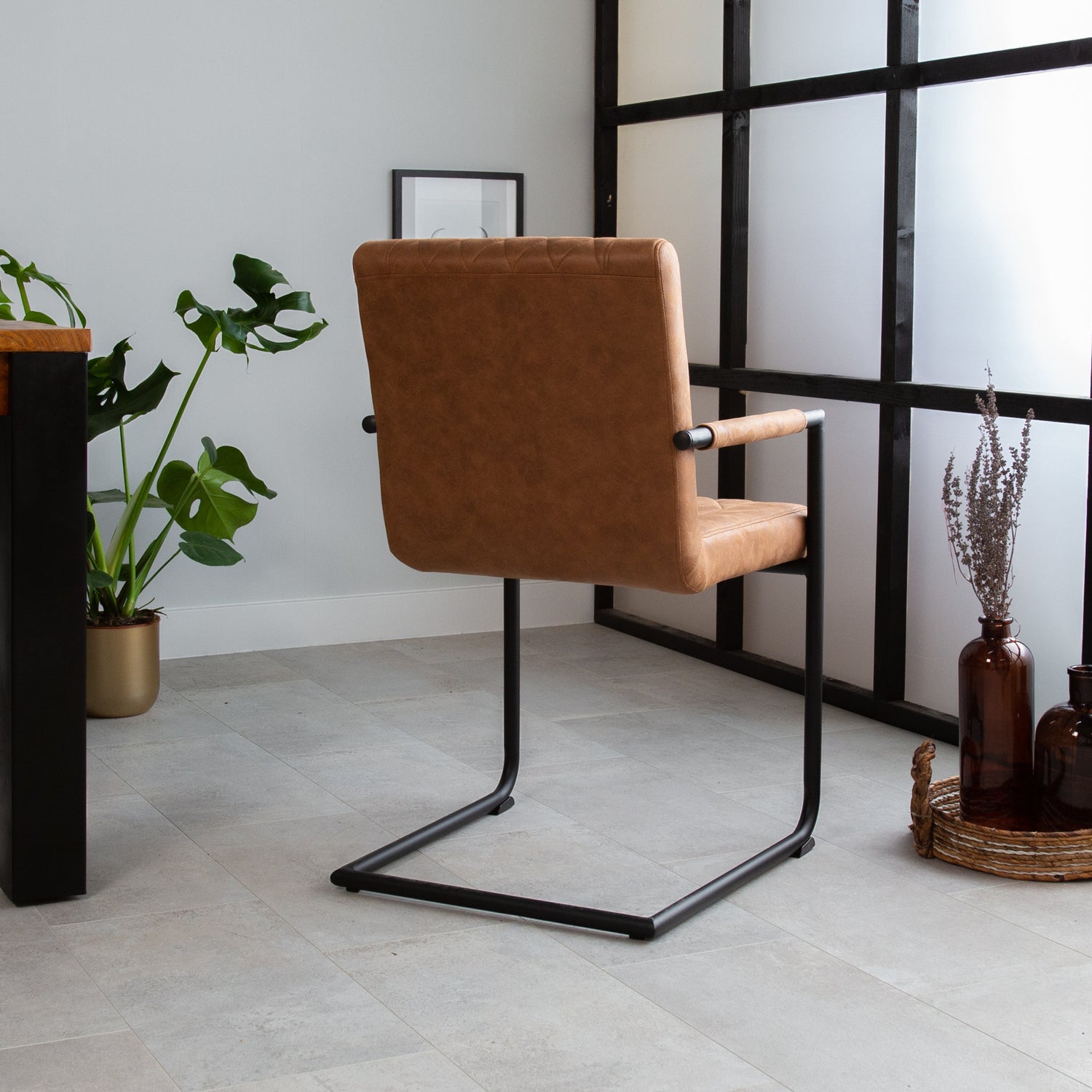 Industriële eetkamerstoel Dean cognac is een plaatje in menig interieur. Deze statige eetkamerstoel heeft een microvezel zitting met stoer zwart gepoedercoat metalen frame.
