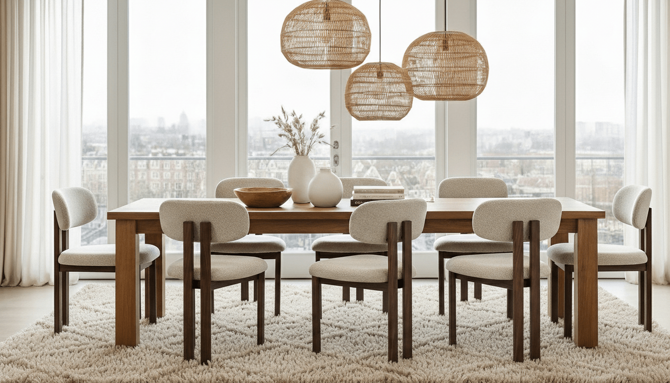 Bouclé, een duurzame en luxueuze stof met zachte textuur en lusjes, voegt comfort en stijl toe aan meubels, waardoor het perfect is voor een warme en chique uitstraling in elk interieur.