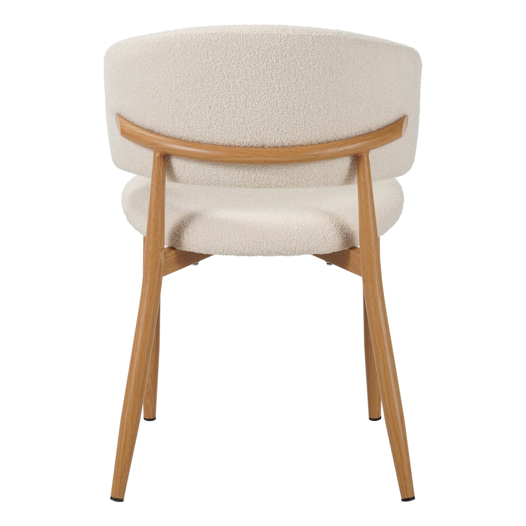 Eetkamerstoel Yuka is een echte eyecatcher voor jouw eethoek! De zachte bouclé stof in beige kleur zorgt voor een warme en stijlvolle uitstraling, terwijl de ronde vormen van de rugleuning de stoel een moderne, speelse look geven. Dankzij de combinatie van een comfortabele zitting en stevige metalen poten met eiken houtlook past Yuka perfect binnen een Scandinavisch of Japandi interieur.