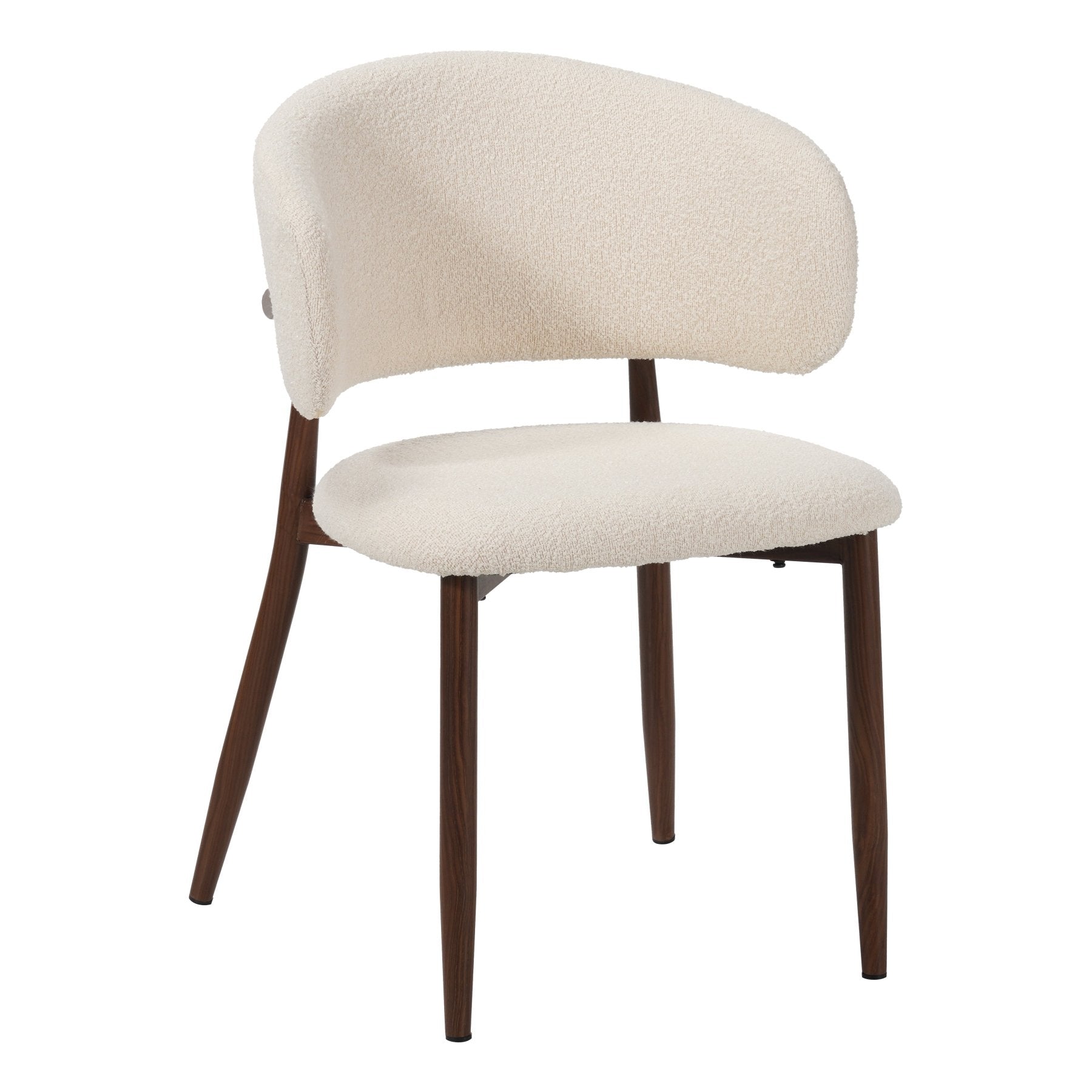 De Yuka eetkamerstoel is bekleed met een luxe bouclé stof, bekend om haar warme, wollige uitstraling en zachte structuur. De poten zijn gemaakt van metaal en afgewerkt met een realistische walnoot houtlook, waardoor de stoel de perfecte balans biedt tussen stijl en stevigheid. De combinatie van zachte stof en natuurlijke tinten zorgt voor een tijdloze look.