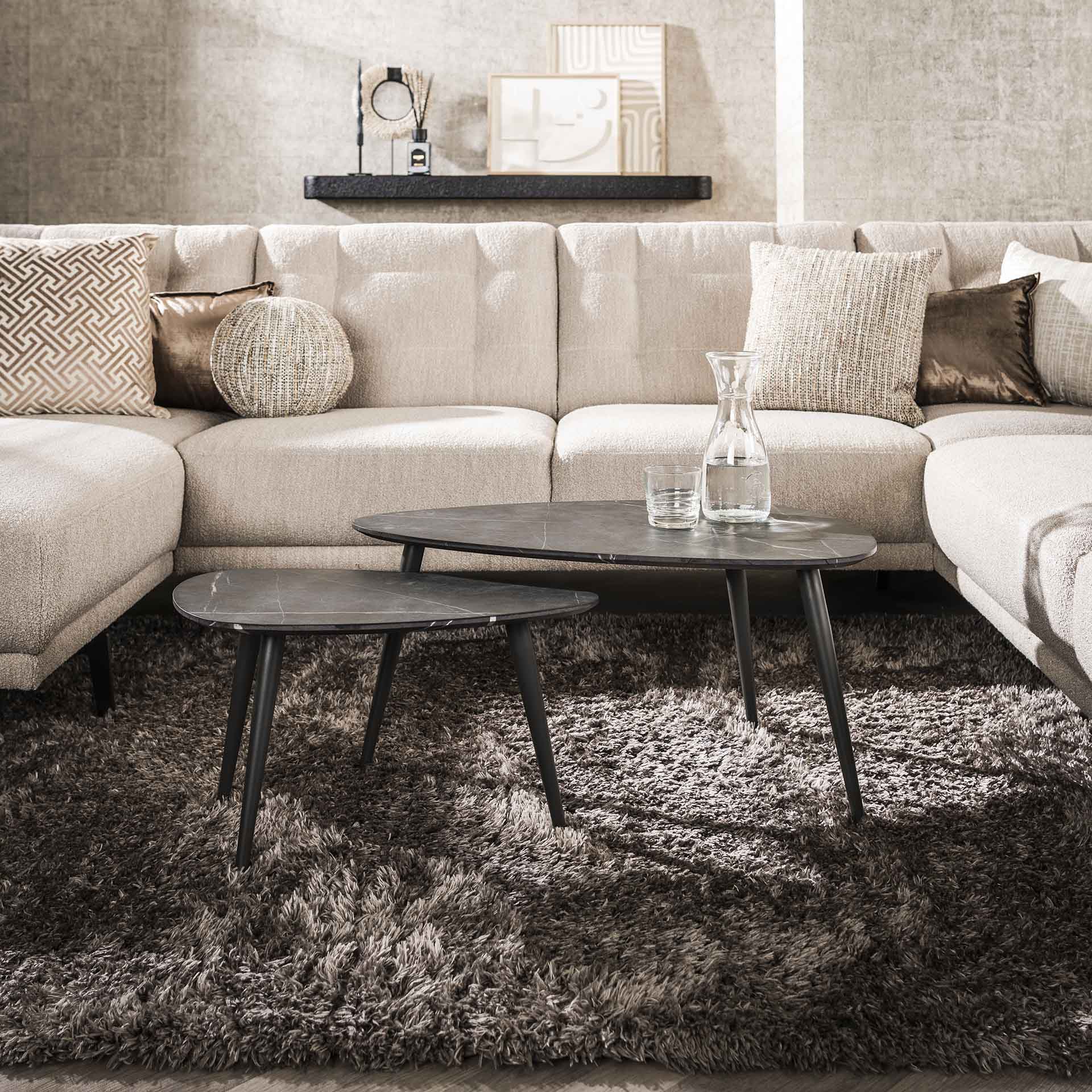 De Kiezelvormige salontafel set van 2 keramiek look grijs heeft een elegant en eigentijds ontwerp. De organische, driehoekige vormen (ook wel kiezelvormig genoemd) van de tafelbladen geven een speelse en natuurlijke uitstraling, terwijl de slanke metalen poten zorgen voor een modern contrast. De Conner tafelset is uitgevoerd in melamine met een keramiek uitstraling. De tafel is haast niet te onderscheiden van een keramiek tafel. Het handgemaakte tafelblad is voorzien van een laagje melaminehars dat is aangebracht op hout. Het materiaal wordt door hitte en druk aangebracht en is onderhoudsvrij.