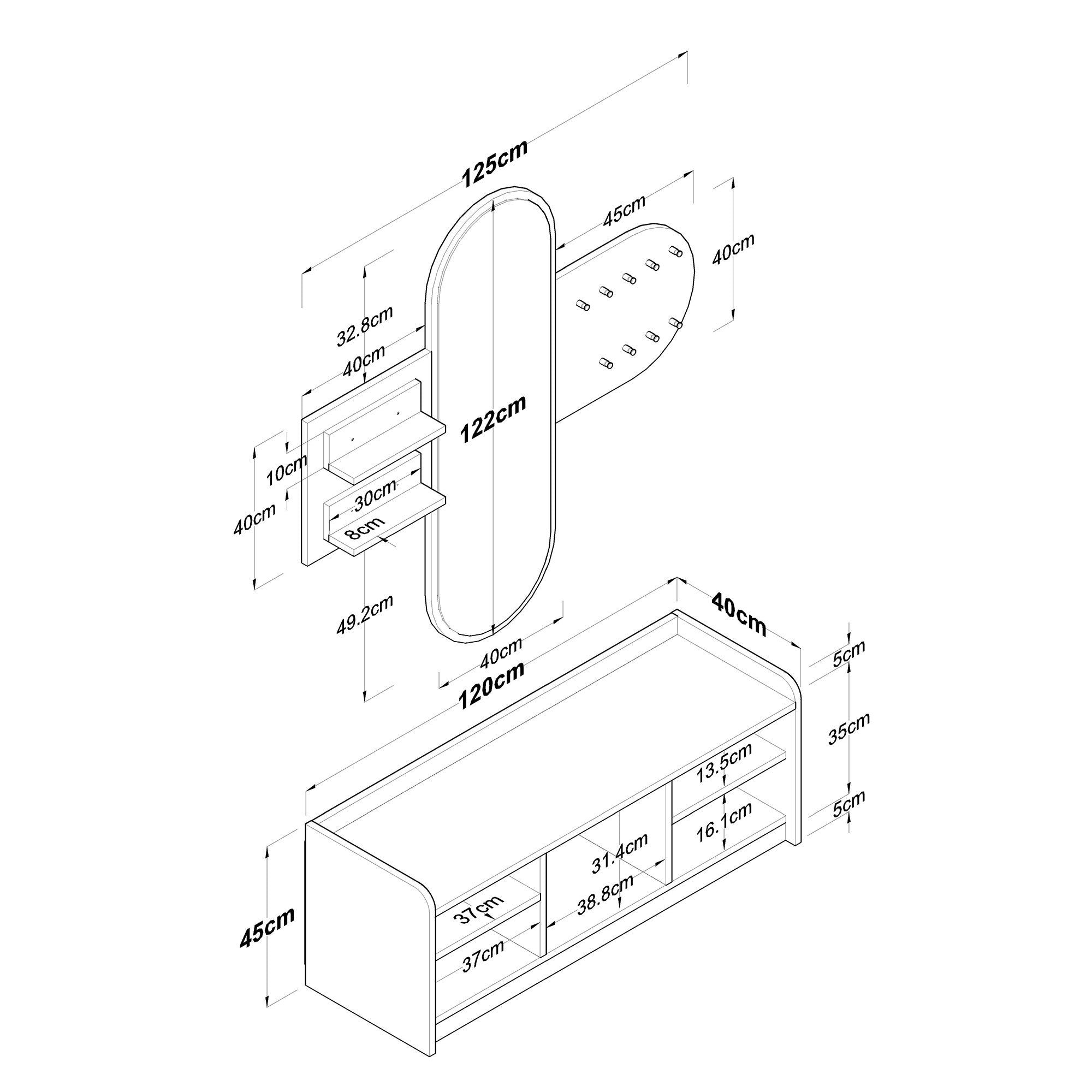 - Afmetingen kast: Breedte: 120 cm, Hoogte: 45 cm, Diepte: 40 cm