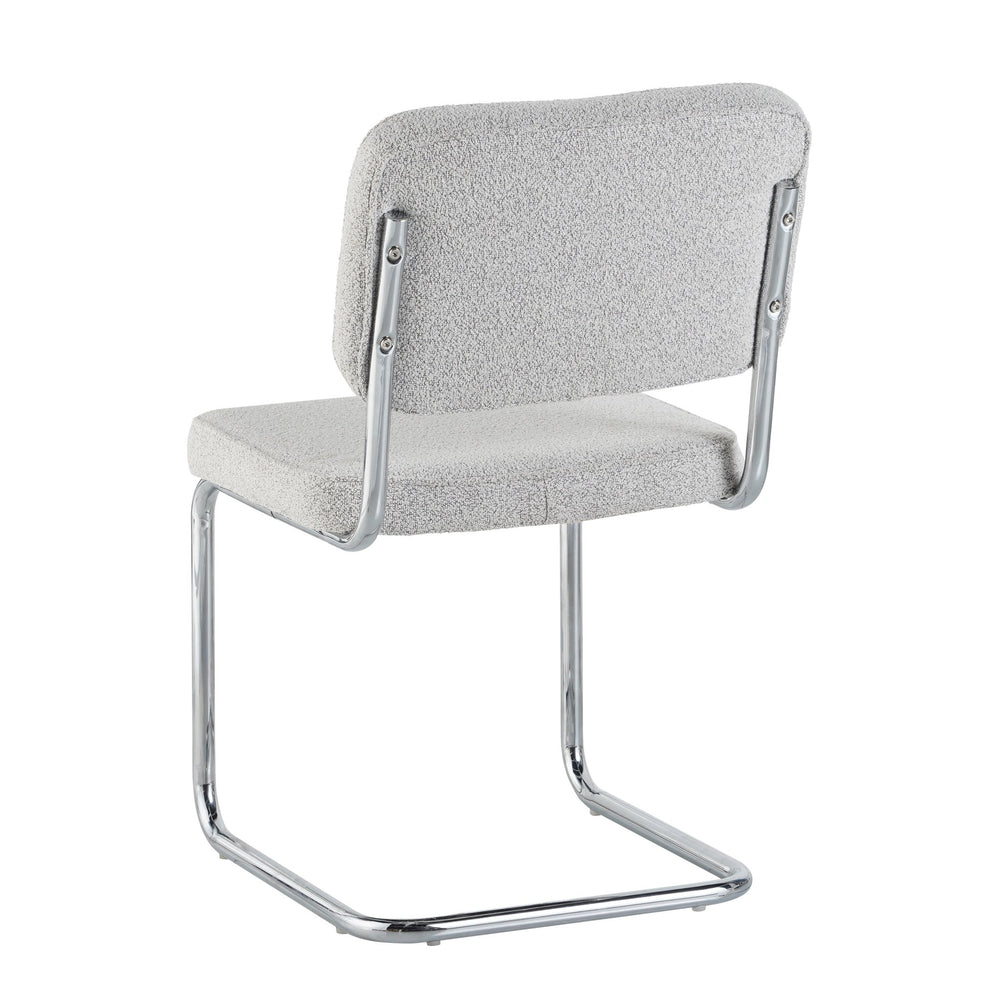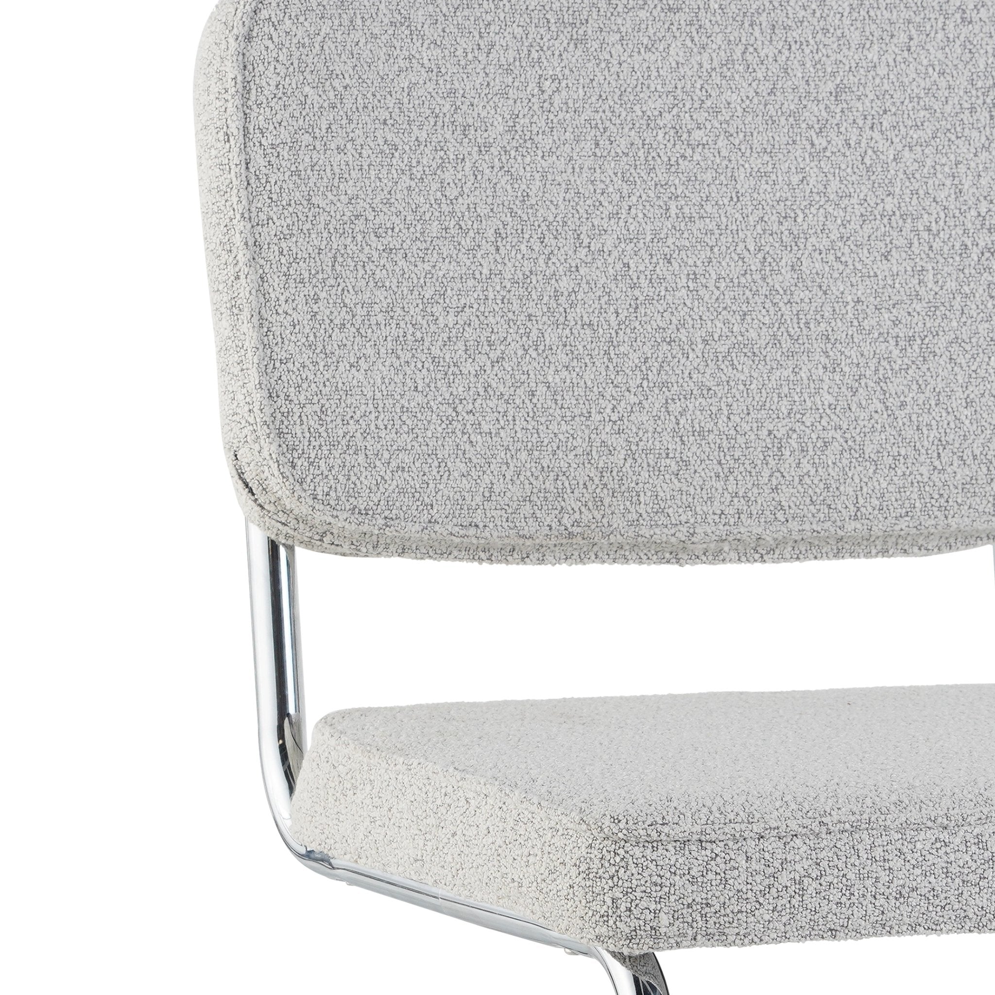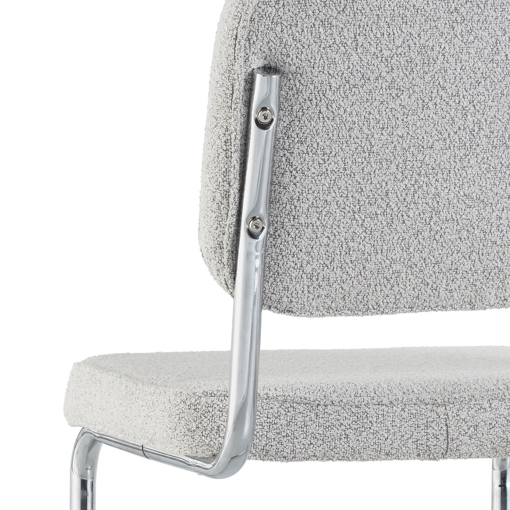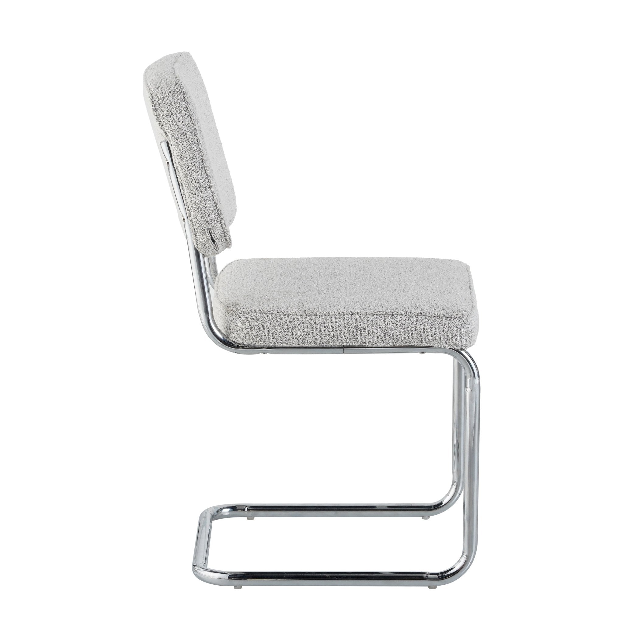 Beschrijving en specificaties van Moderne Eetkamerstoel Grijs Bouclé Stof Sway - Chrome Frame - Zonder Armleuningen