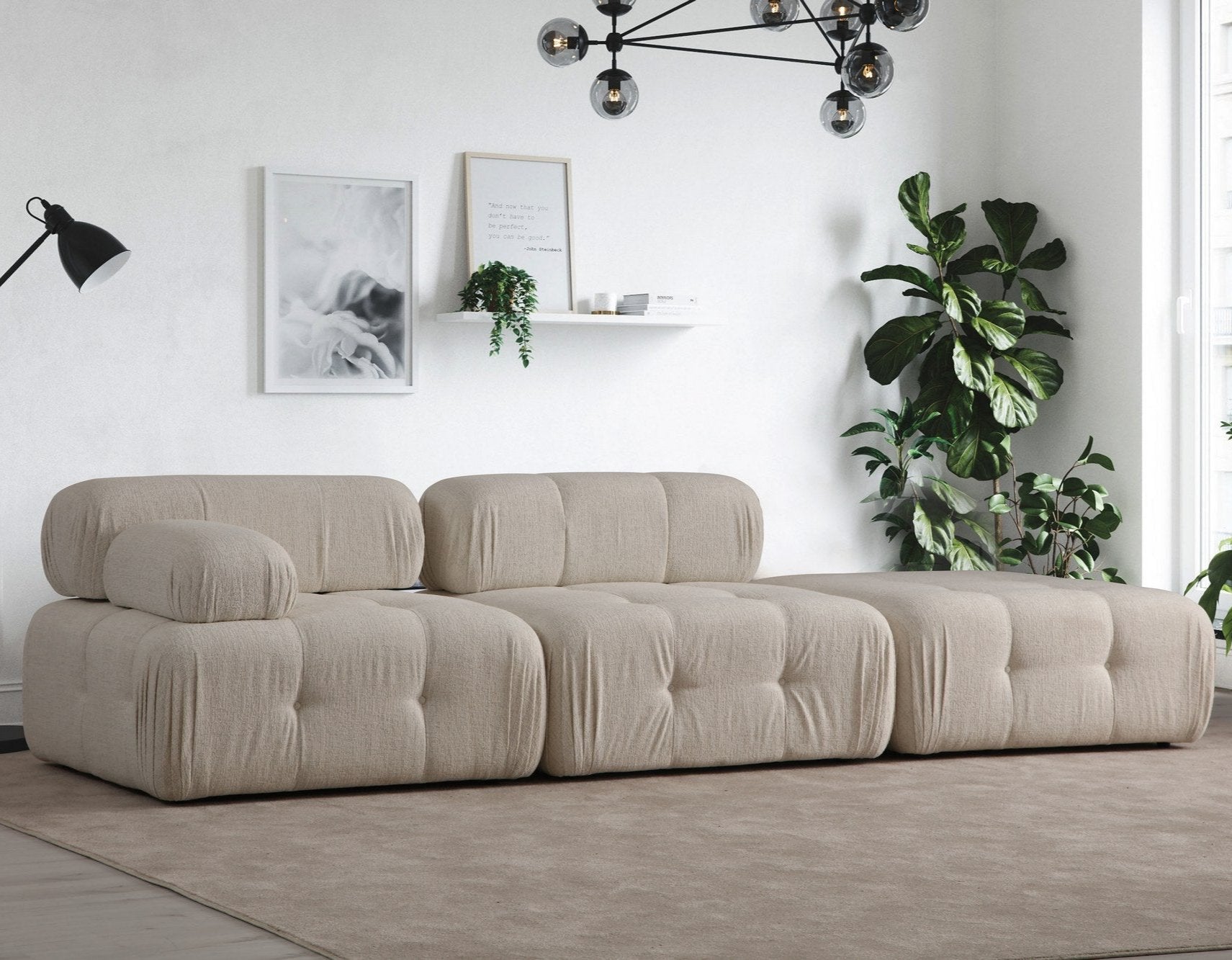 Deze bank is gemaakt met een strakke en moderne esthetiek en voegt een vleugje verfijning toe aan elke kamer. De crèmekleurige stof straalt elegantie uit en past bij verschillende interieurstijlen. Dankzij het verschuifbare rug- en armmechanisme van het sofasysteem kun je je zitpositie aanpassen en ben je verzekerd van maximaal comfort voor elke gelegenheid.