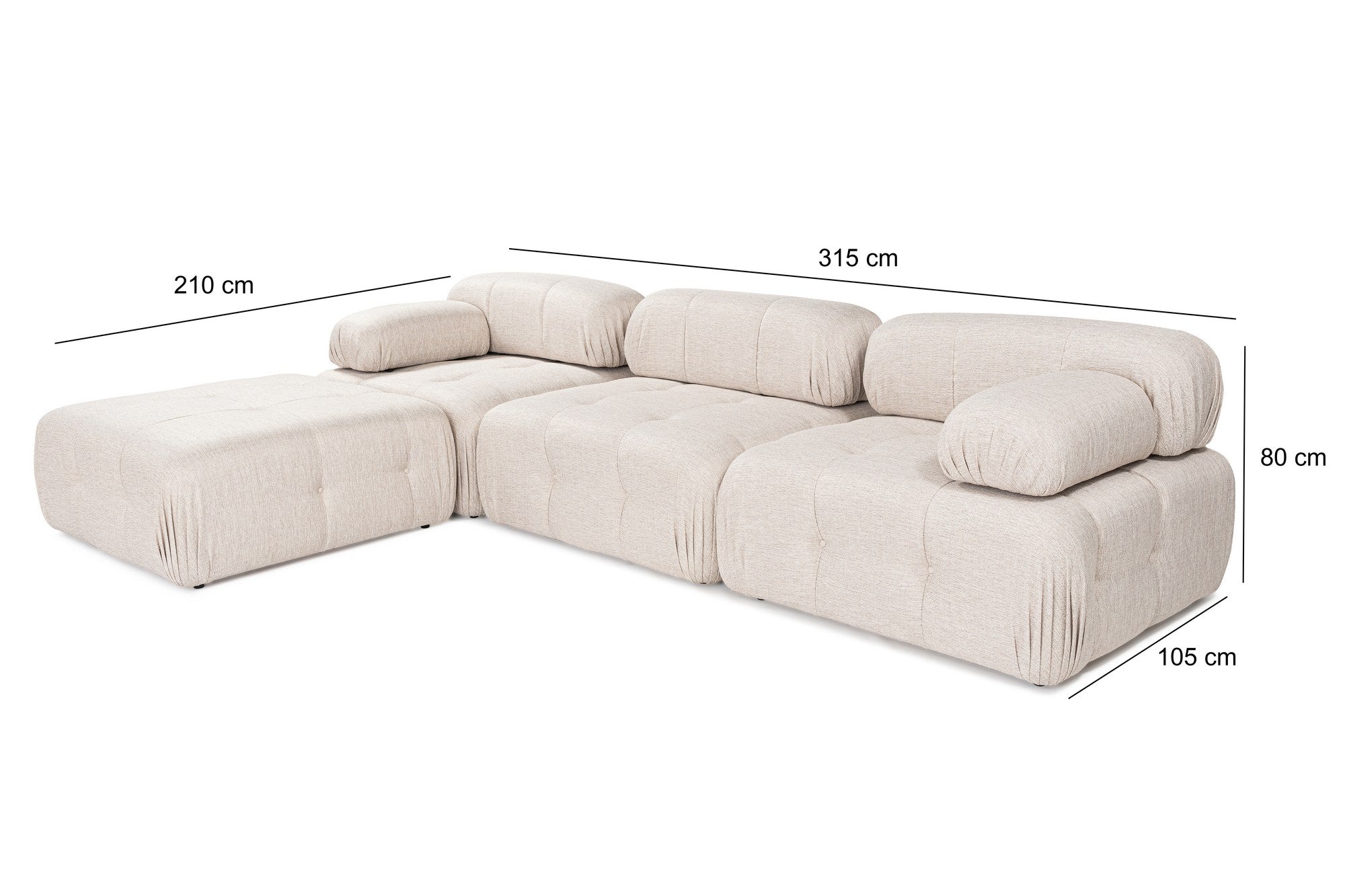 - Afmetingen: Lengte: 315x210 cm, Breedte: 105 cm, Hoogte: 80 cm
