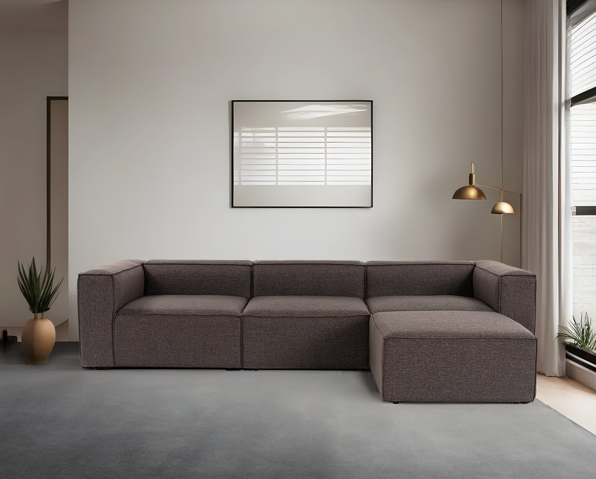 Beschrijving en specificaties van Modulaire hoekbank met losse hocker donker bruin linnen stof Fora