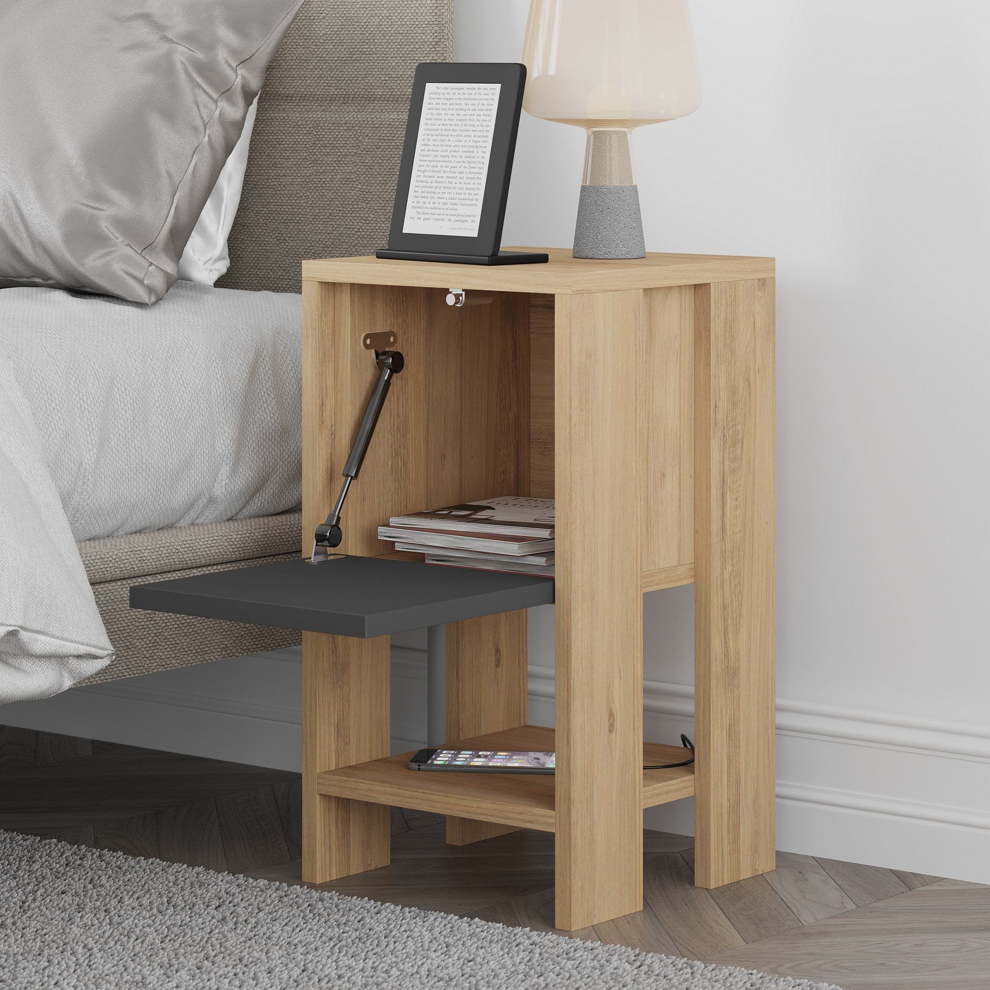 Met een effen kleurenconcept past ons nachtkastje naadloos in elke interieurstijl en voegt het een vleugje moderniteit en nieuwigheid toe aan je slaapkamer. De combinatie van eikenhout en antraciet creëert een prachtig visueel contrast, waardoor het een pronkstuk in je kamer wordt.