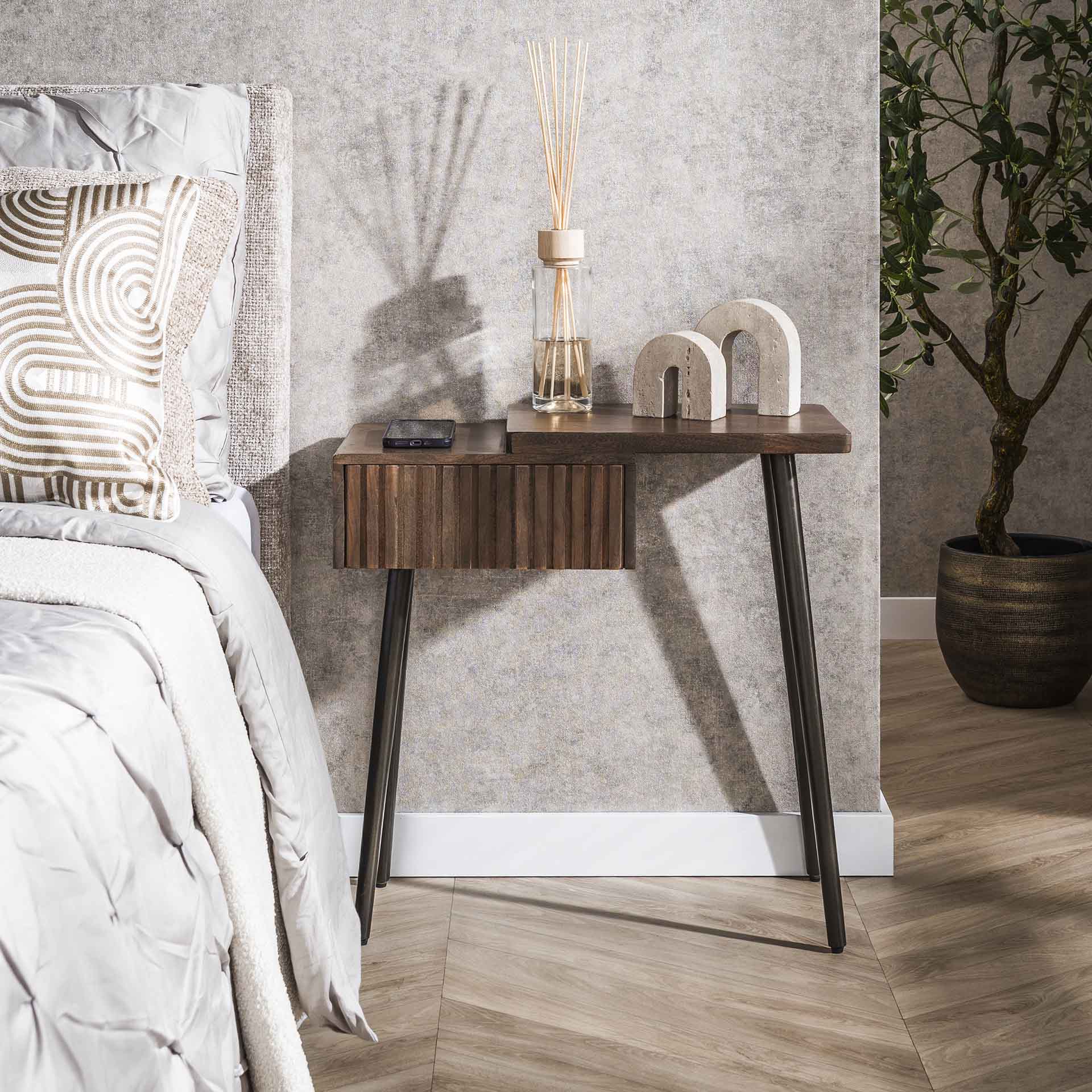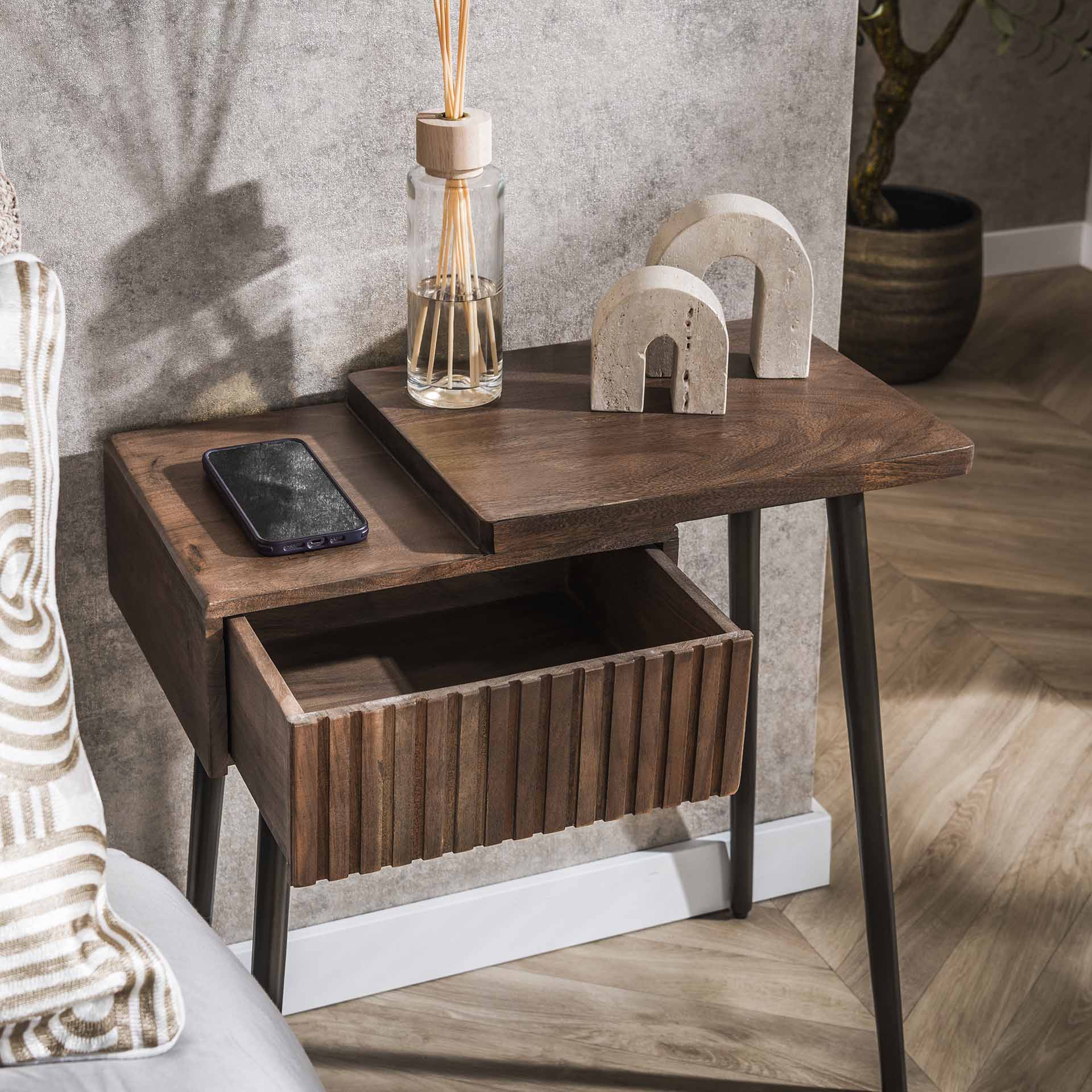Beschrijving en specificaties van Nachtkastje Oslo Rechts Acaciahout Drift Brown 1 Lade