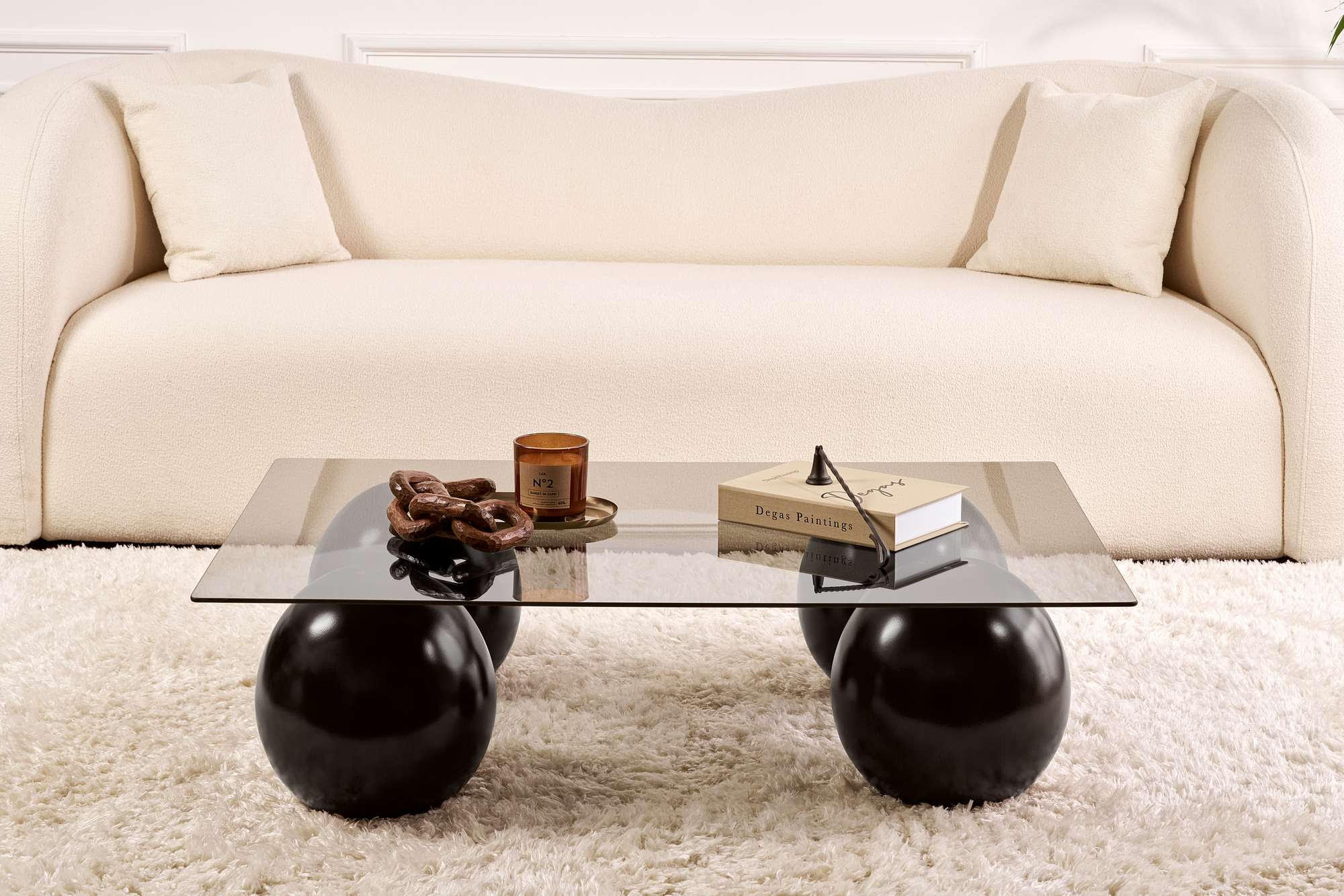 Rechthoekige salontafel grijs getint glas zwarte bolpoten Sera 110x75 cm