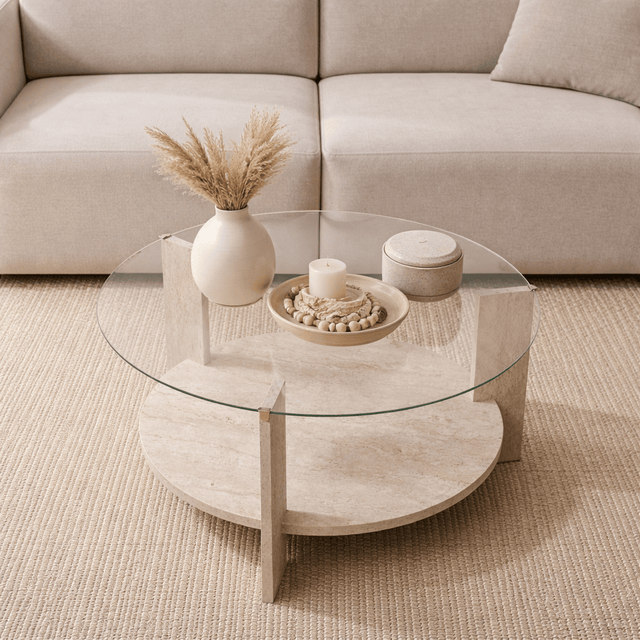 Ronde salontafel travertine melamine transparant glas Ø75 cm - Cairo